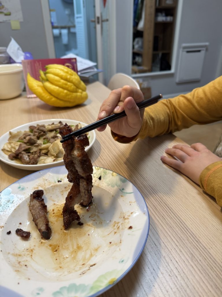 可爱的默默,觉得用小筷子就能少吃点了。爸爸妈妈哈哈大笑!
