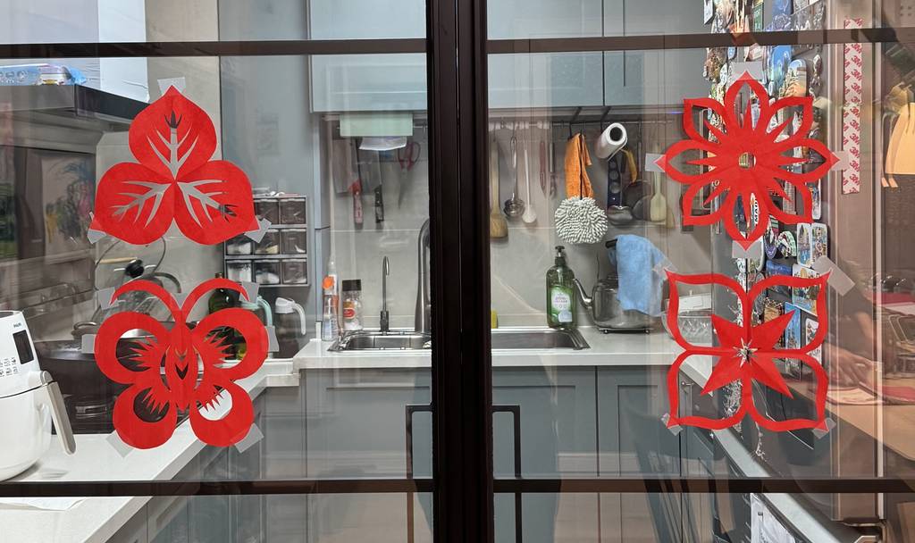 马上过年,默默和妈妈一起剪窗花,贴窗花,贴春联,忙的不亦乐乎!看看我们的成果: