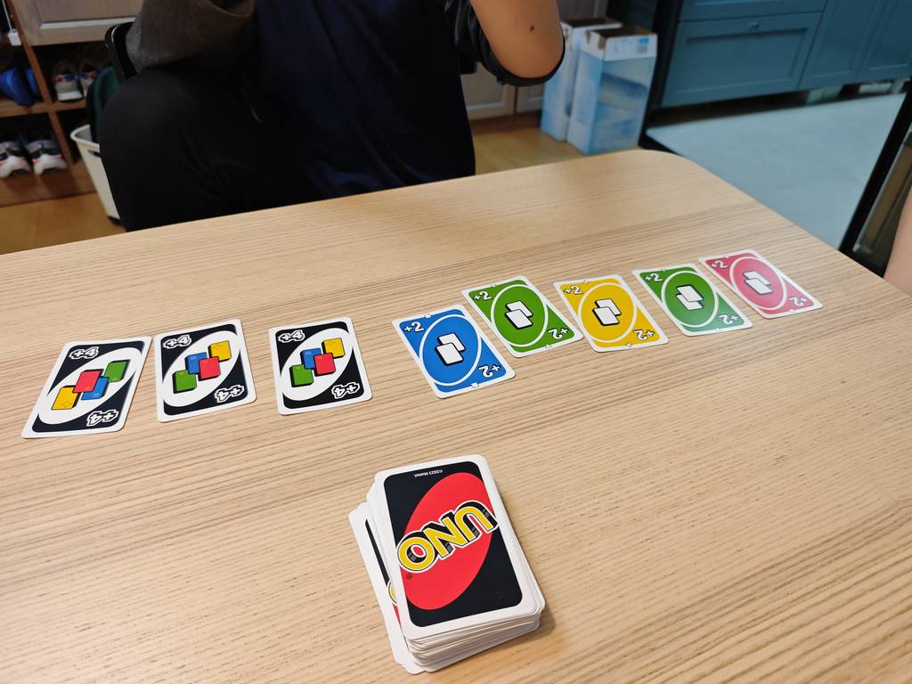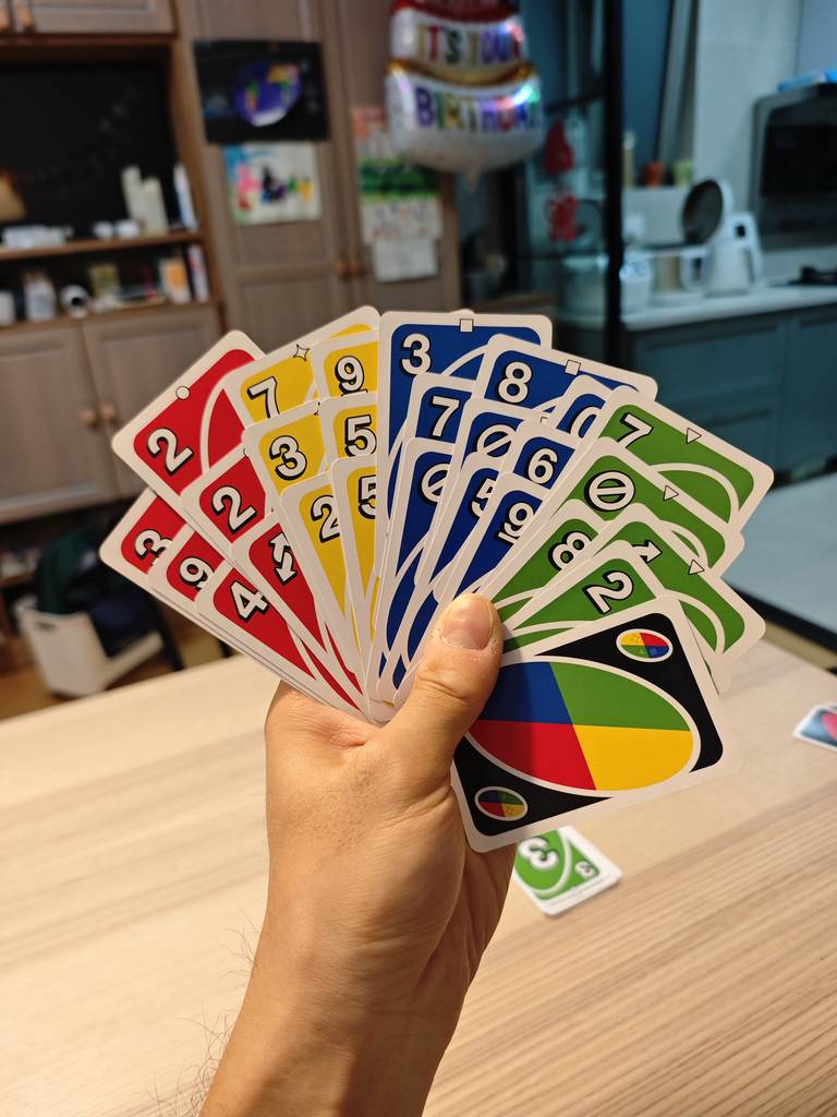 晚上玩UNO,爸爸吃了一手22张牌,破了记录了。。。