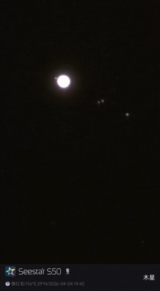 夜色渐黑,跟默默聊起最近有一颗彗星马上要过近日点,手机一查正好是今天。可惜它离太阳太近,只有0.04AU,看是不可能了。不过抬头看到头顶的木星,默默说我们去拿望远镜来看吧。木星现在位置很高,大气影响小,于是我们去楼上拿了望远镜。一番调试升级之后,居然很顺利的就找到了木星,还看到了4颗明显的伽利略卫星。把曝光调低,还能偶尔看到一点表面的纹路。今天的运气不错。