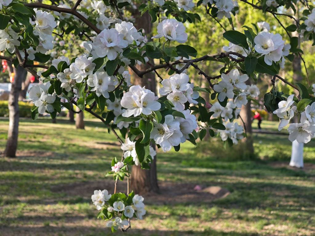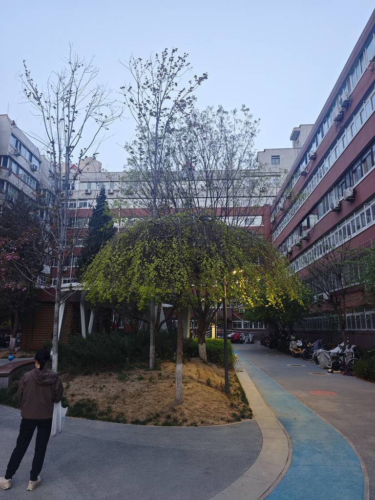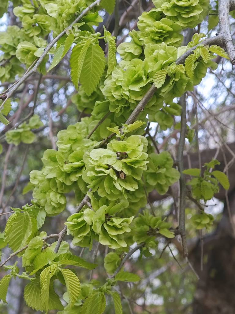 妈妈从外面遛弯回来一起看了看院子里的花。玉兰海棠都开的正好。一棵剪成伞状的榆树结了厚厚的榆钱。