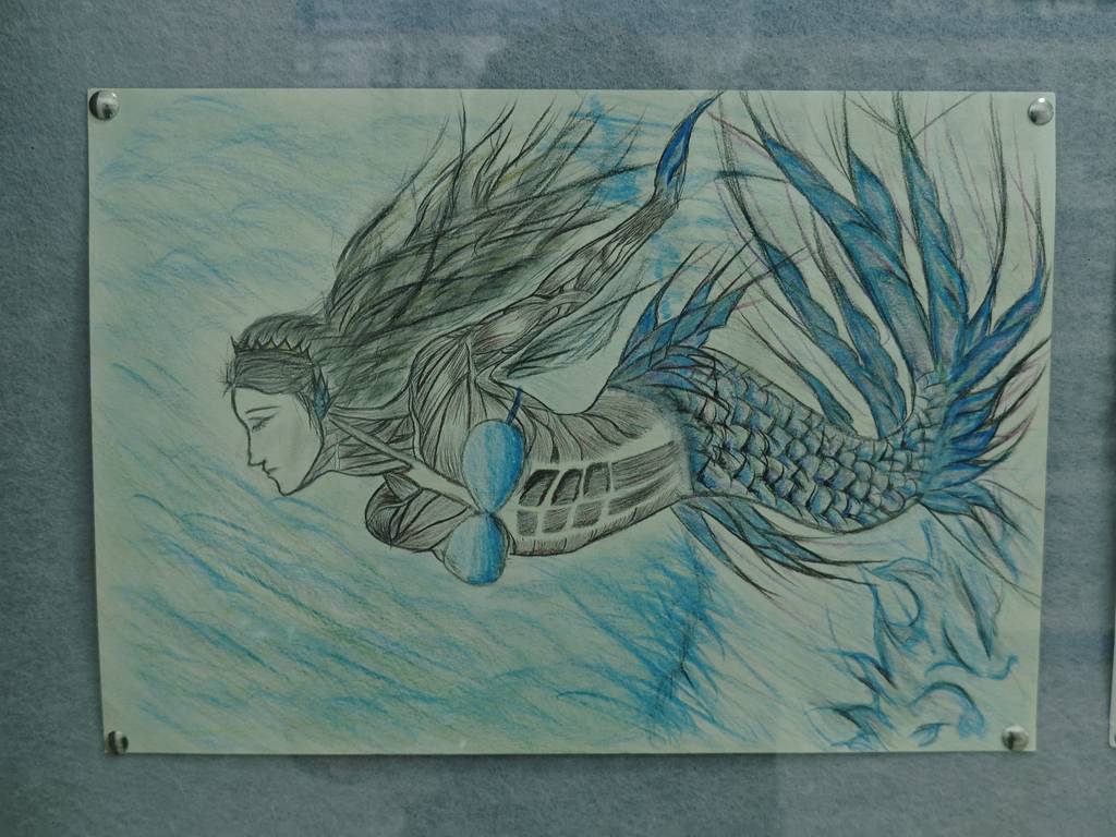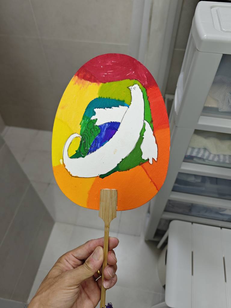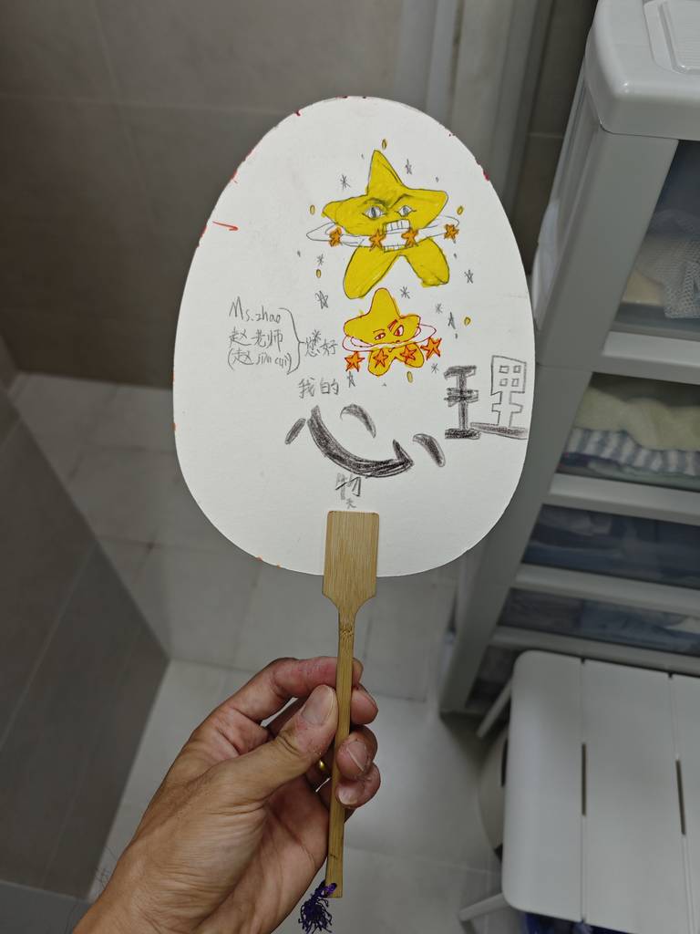 默默的心理课作业要自己画一个木板扇面。正面这个非鸟非鱼的东西,默默本想画只鸟,最后忘了,草草画了个鱼尾,充分体现了自己的不靠谱。