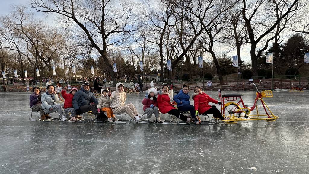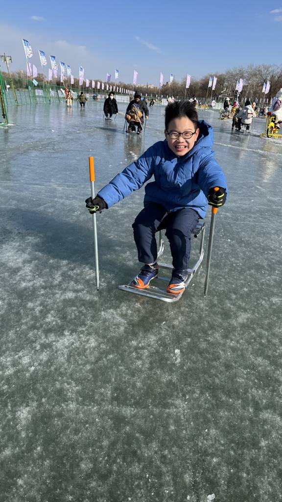 今天爸爸继续去公司加班,妈妈带默默去玉渊潭冰场玩得很爽。玩了冰爬犁,还有很长很长的冰上火车接龙。