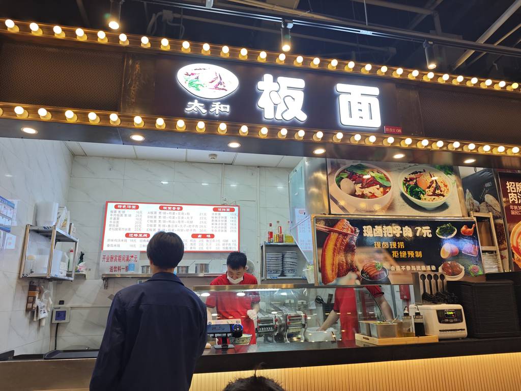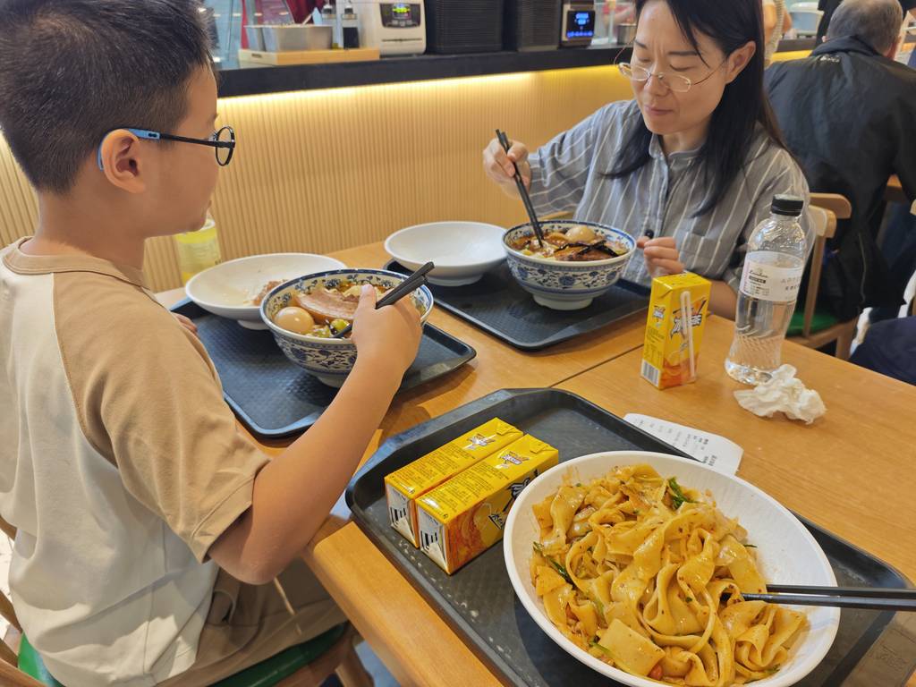 今天要为明天回湖南做准备,一家人去银座迪卡侬买了几双鞋。默默吃上了念叨的板面。