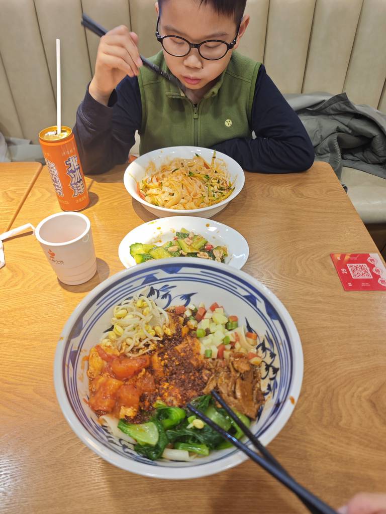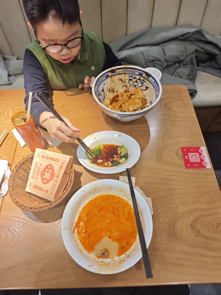 一周过去,妈妈今天回家啦,家里又热闹起来了。爸爸和默默先去公司,本想再打一会儿乒乓球,不过默默上网课急着提前进教室抢金币,最后没打成。上完课我们去汉唐小馆吃了碗面,然后去机场接了妈妈回家。