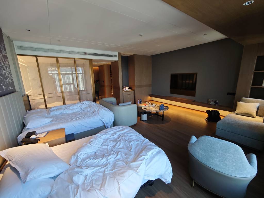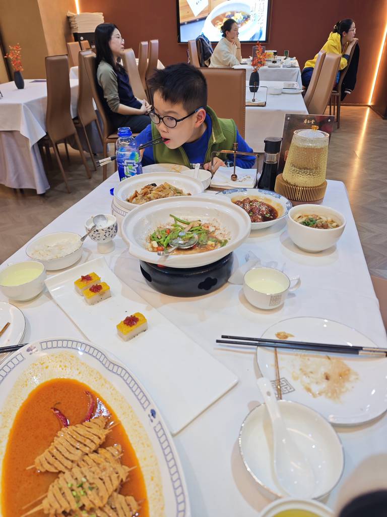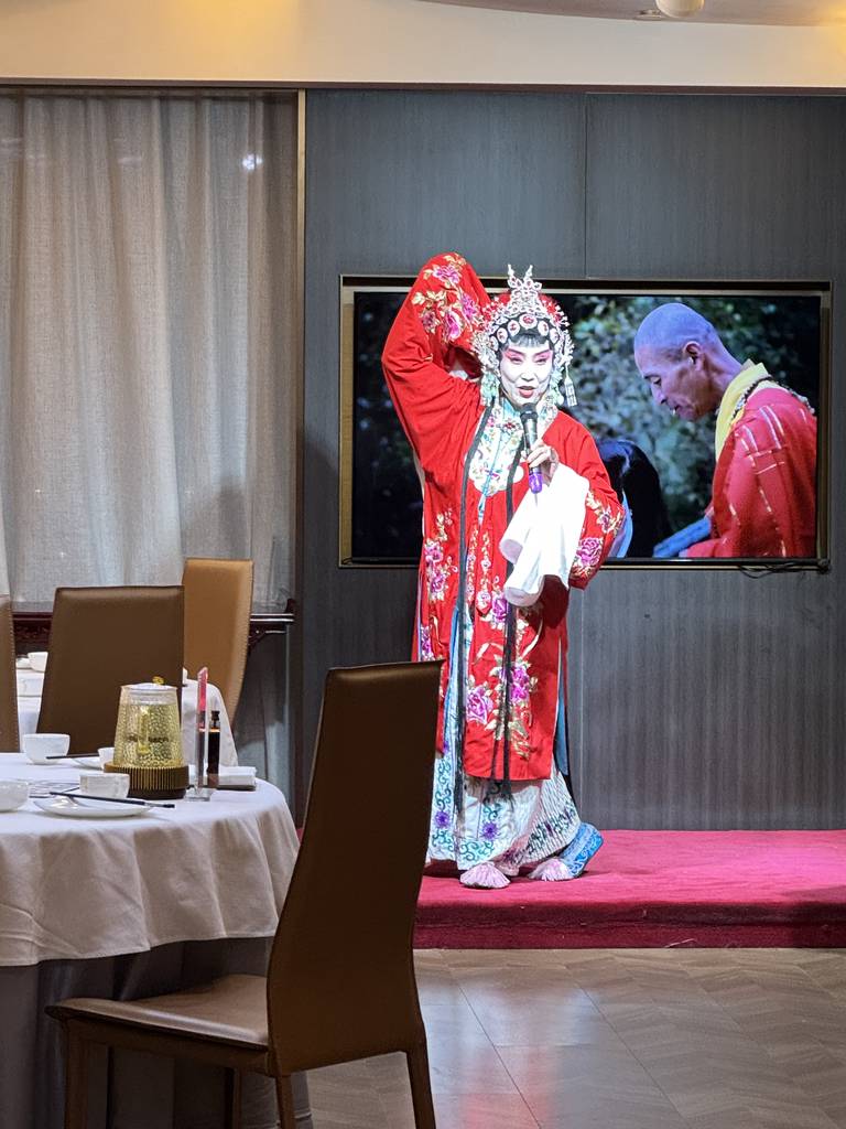 看过唐叔虞祠、难老泉和舍利生生塔,正好到了下班时间。我们回宾馆7层的杏花堂餐厅吃饭。餐厅的服务特别好,甚至还找了一个名角来唱戏,只是我们听不大懂。不过山西菜的口味跟我们的喜好不太相合,有点过于油腻了。