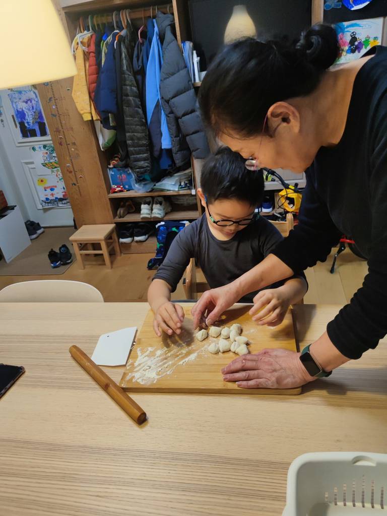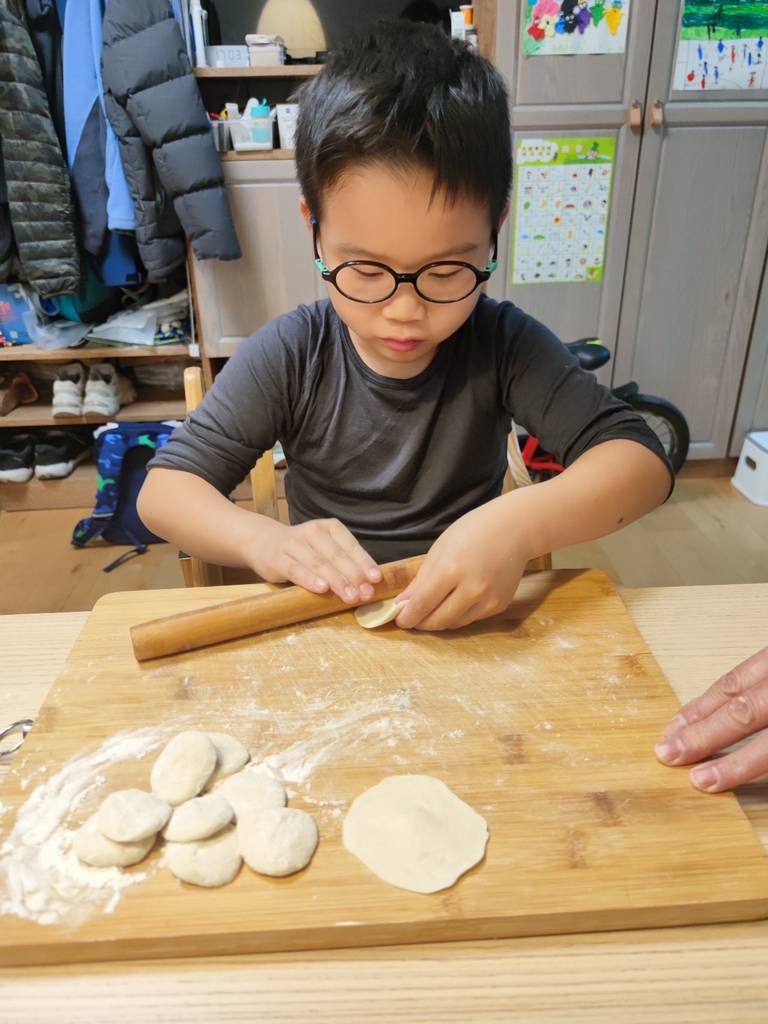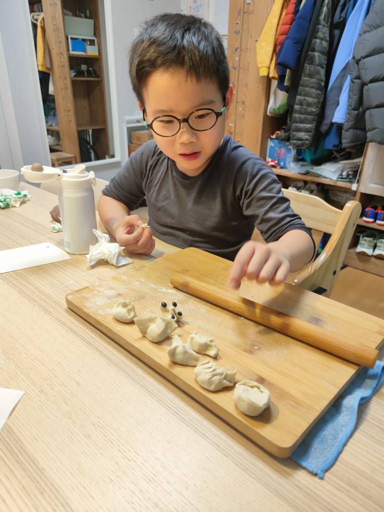 昨天的劳动课上老师教了同学们包饺子,不过在课堂上是用粘土模拟的。一共有8种包法,默默成功学会了6种。默默跟奶奶约好了今天来试试包真的饺子。跟课堂上不同,奶奶还教了默默怎么撖饺子皮。最后包的饺子因为怕漏馅,最后馅也是用面来假装的。
