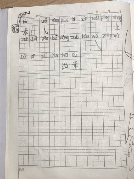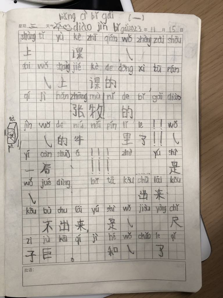 语文老师希望同学们可以用生字本自己写日记。会写的字就写字,不会写的就写出拼音。默默最近的一篇日记记录了跟前座女孩的搞笑日常,非常有趣。