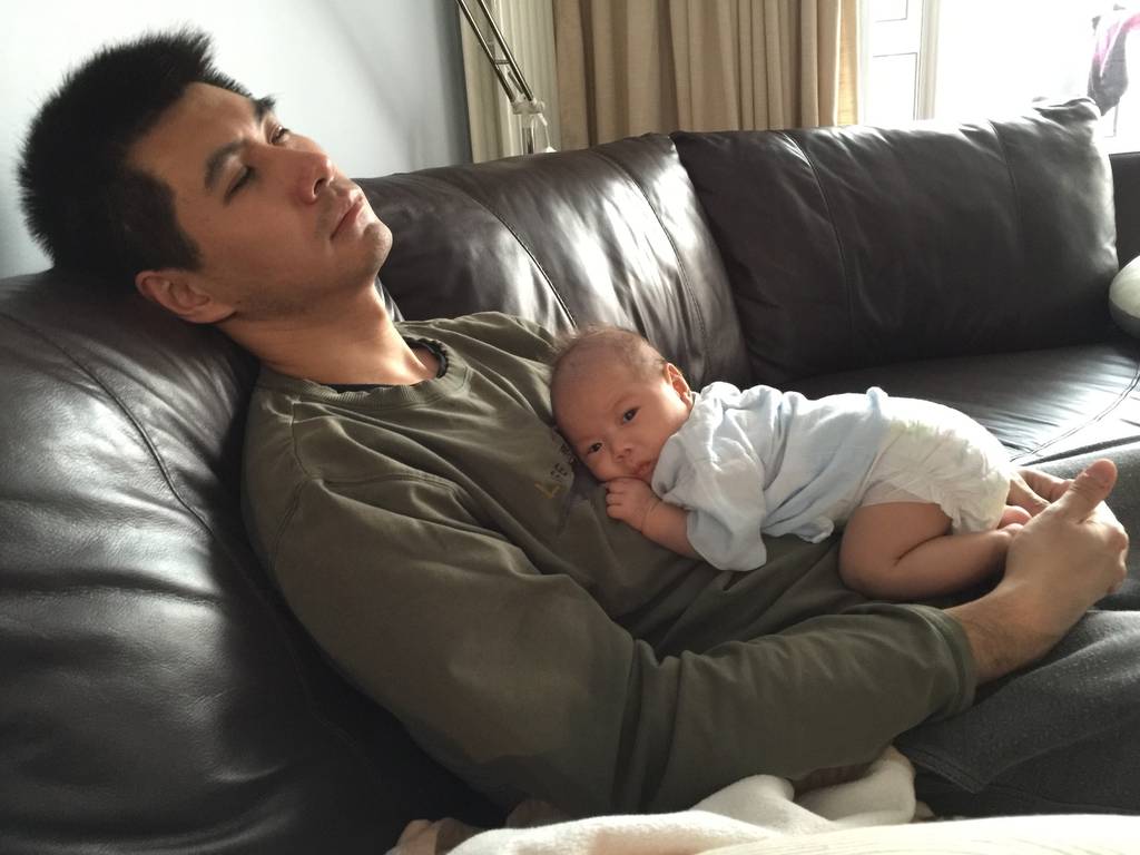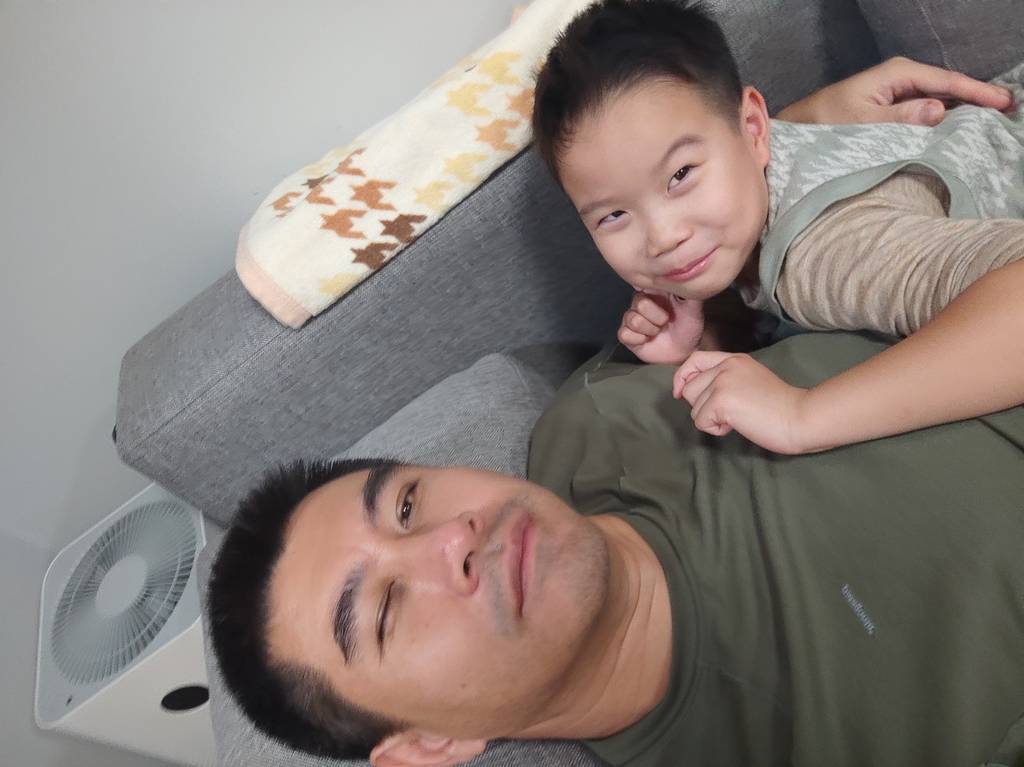 爸爸在沙发上躺着休息,默默爬到爸爸身上玩,爸爸自拍了一张。看着照片就想起了默默还不到两个月的时候也在爸爸身上趴着拍过一张照片,一转眼都快7岁了。