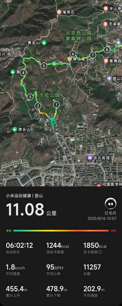 今天走了8.6公里山路。上升也有450多米,也相当于一次正式的大山了。