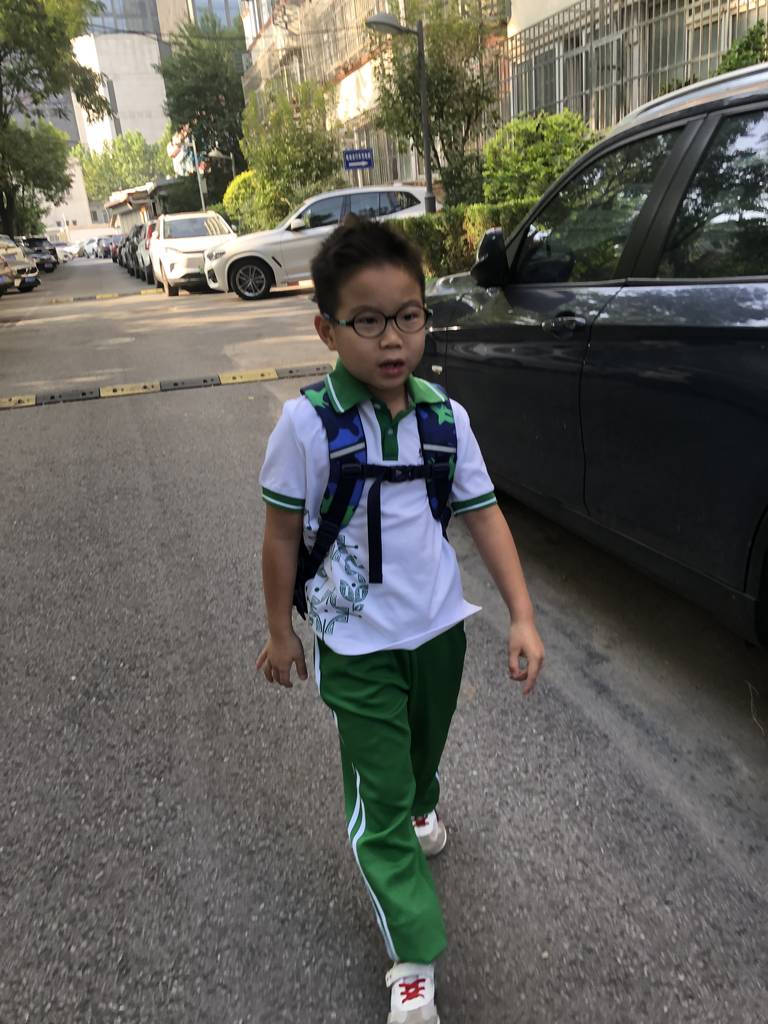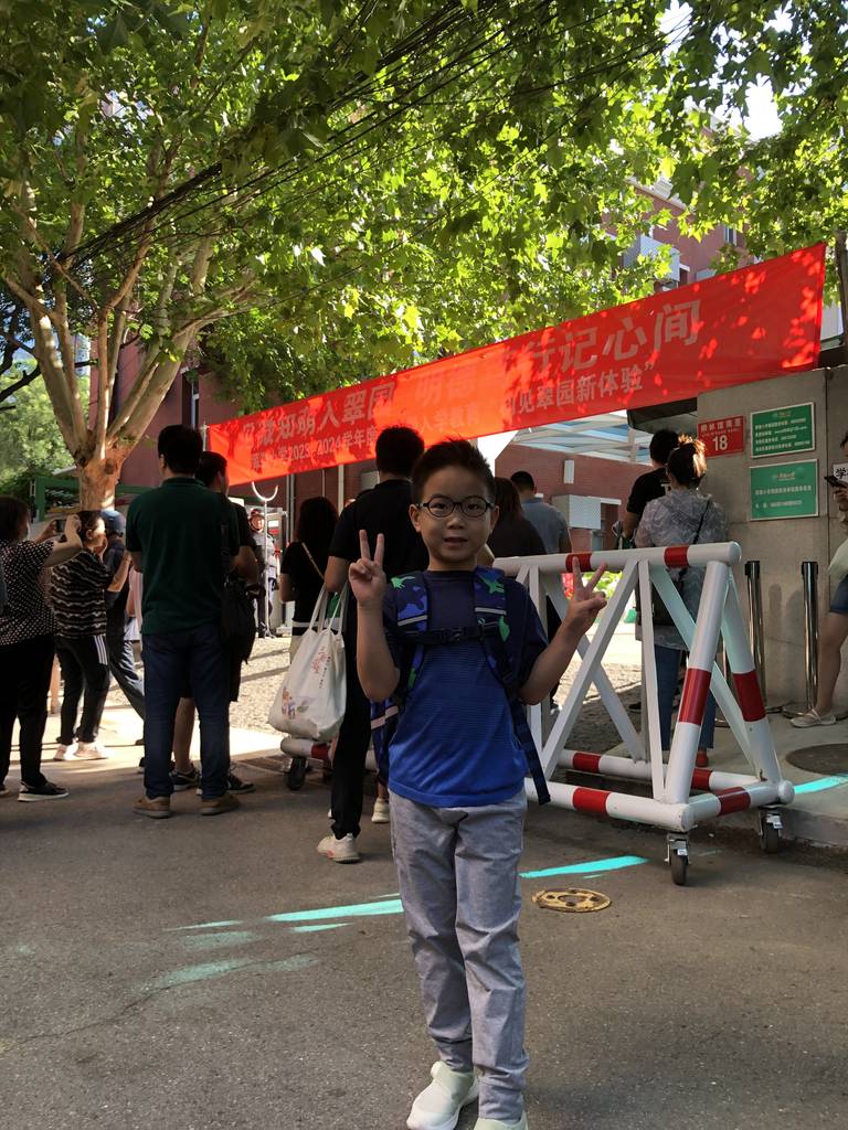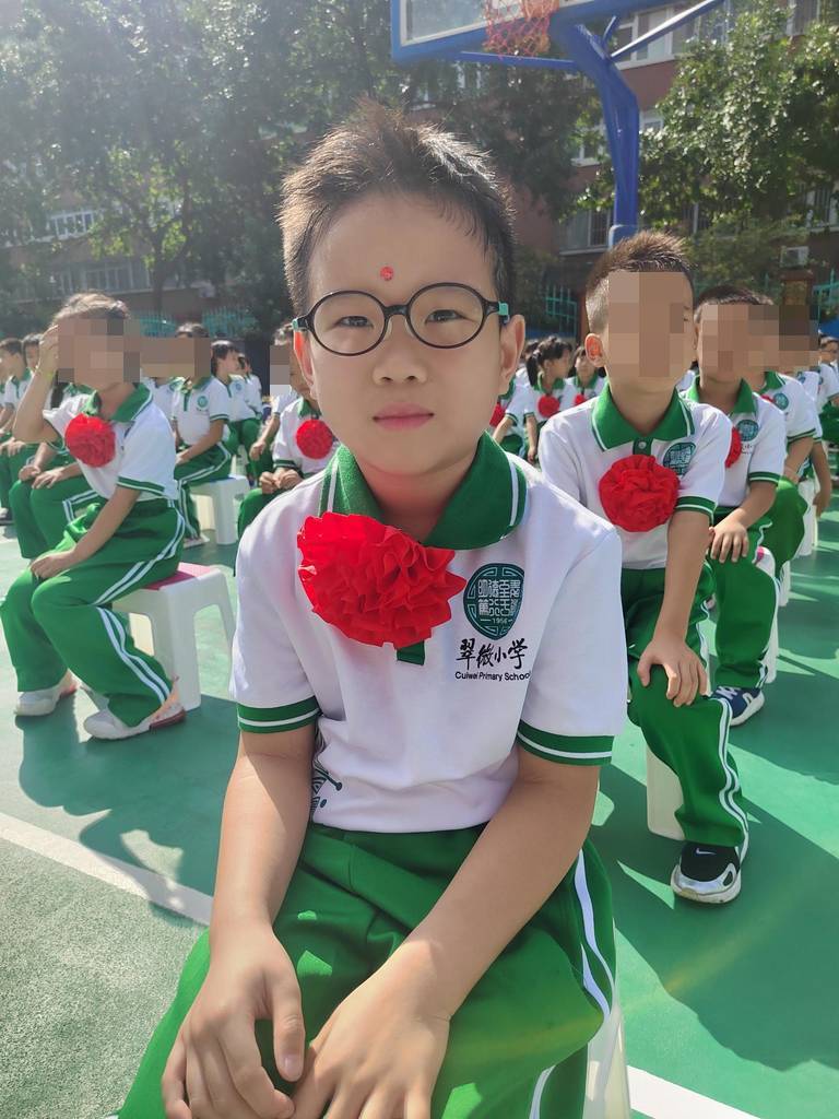穿好校服,准时来到学校。升国旗,唱国歌,戴红花,点朱砂。默默开始期待已久的小学生涯了。