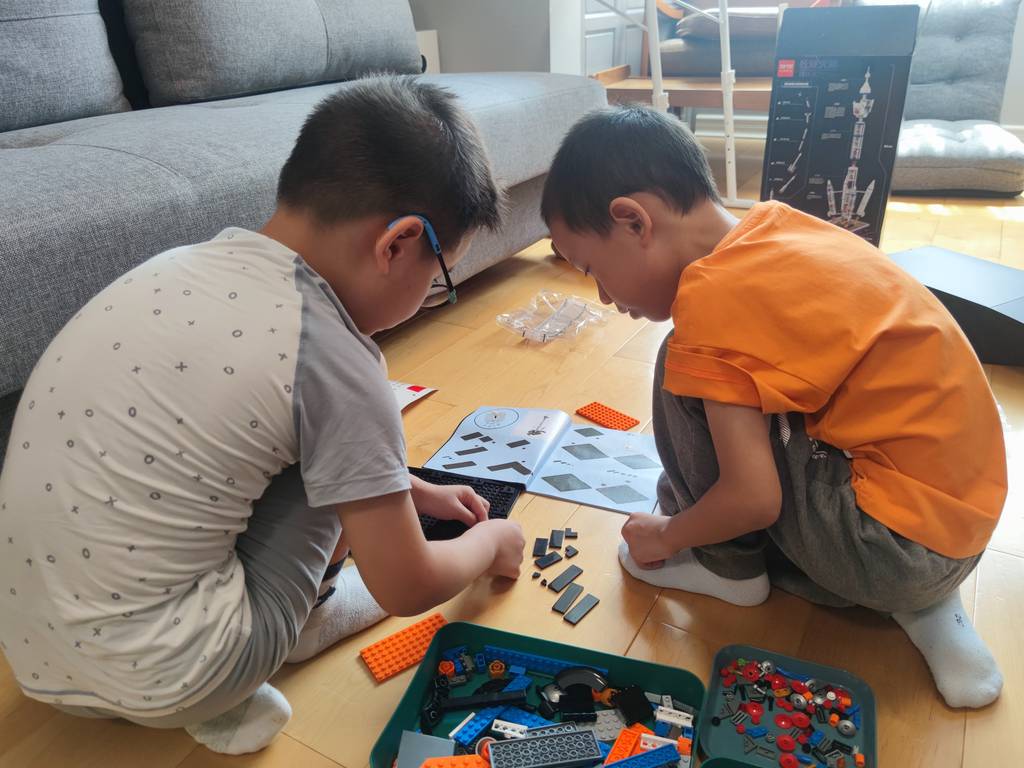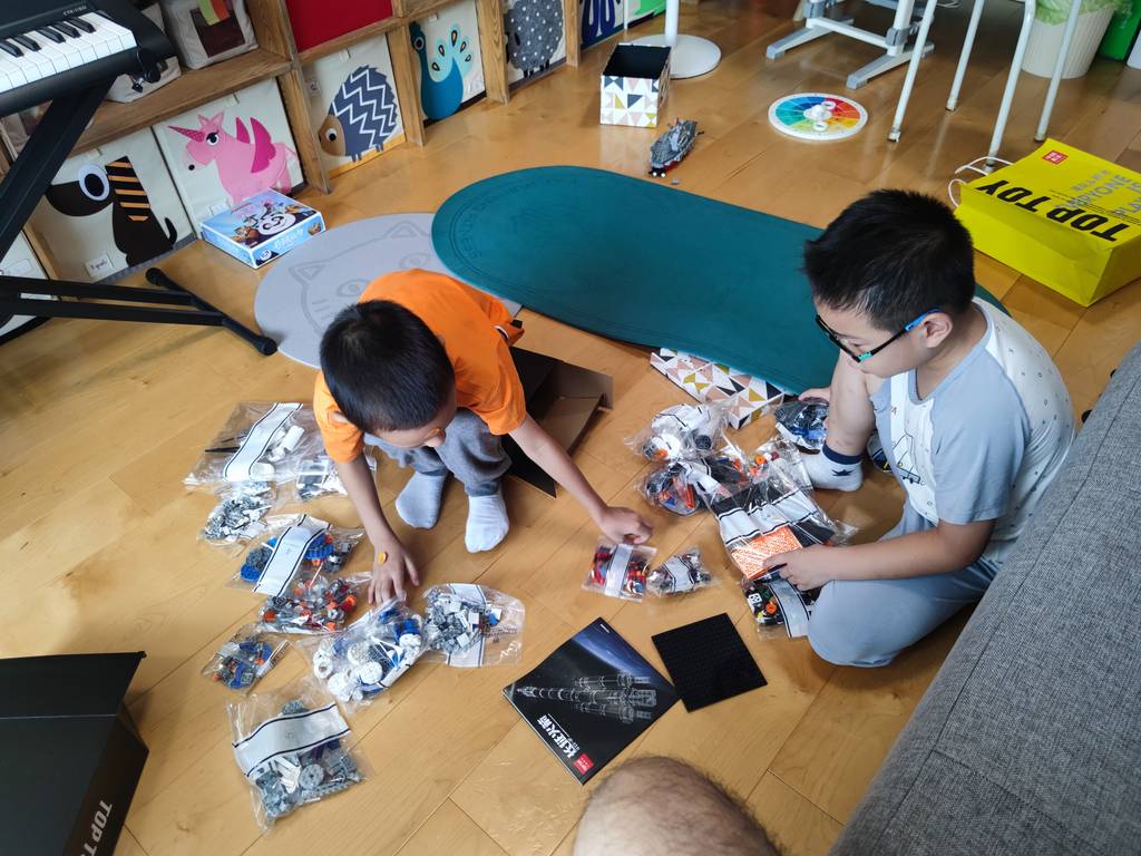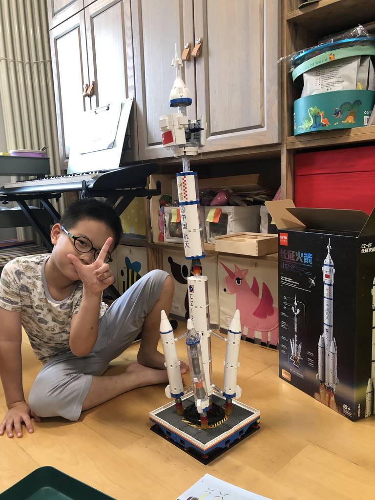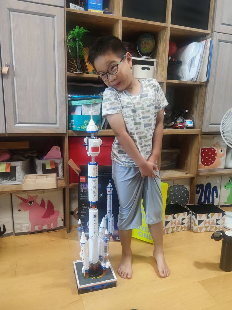 上次陈斌舅舅来时送给默默一个大火箭的积木。上周四默默芒果放学后在家里闲的没事,正好就把它拆开拼了。结果这个火箭很大,拼插有230多步,最后拼了好几天才拼完。中间肖恩也来拼过一小段。今天终于拼完了,原来是一个90cm多的大家伙,还挺壮观的。