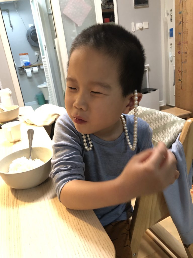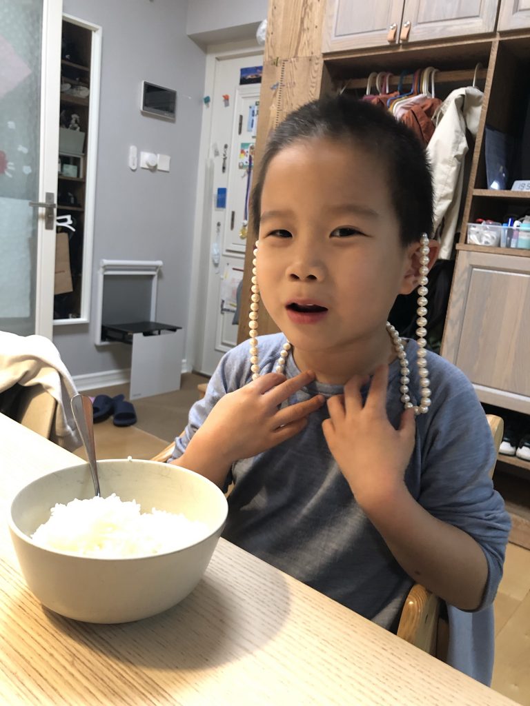 默默戴着妈妈的项链哼着歌,自得其乐。妈妈举起手机,默默说:妈妈,你是在拍我美丽的项链吗?