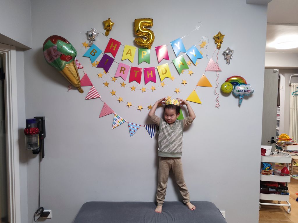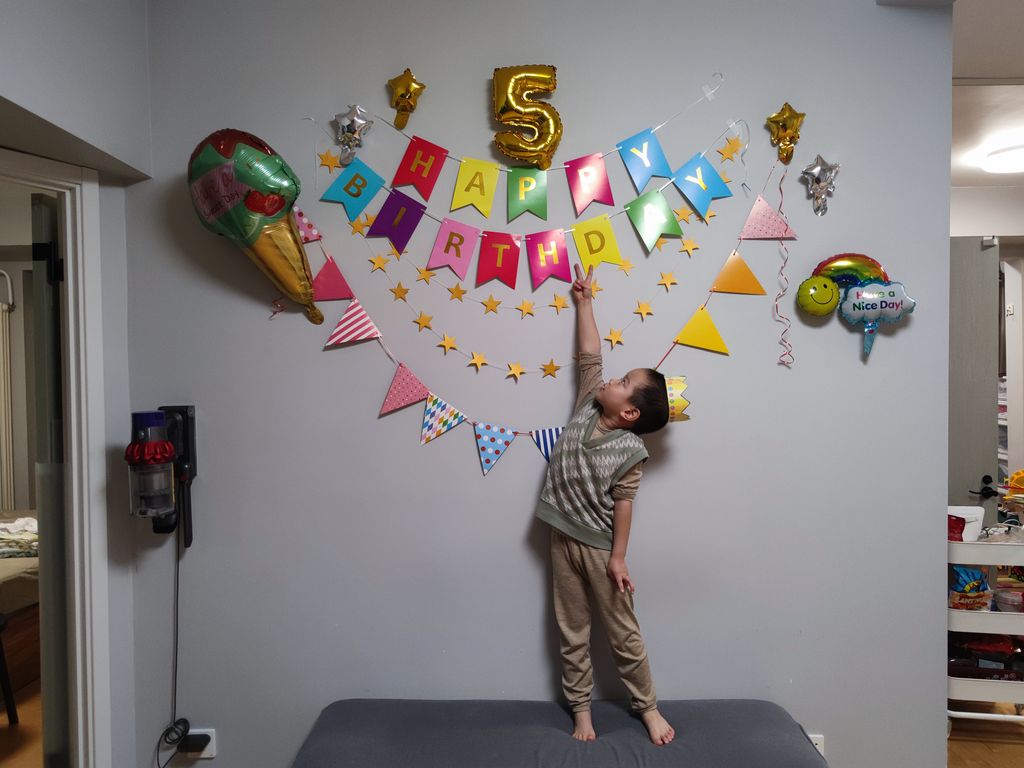 默默今年的生日正好赶上春节前最后一个周六,因为调休变成了工作日。妈妈下午早早地请假回家来布置家,趁着默默睡午觉,爸爸妈妈把背景墙挂了个大概,默默起床后正好赶上尾声,我们一起把所有星星和气球都挂在了墙上。
