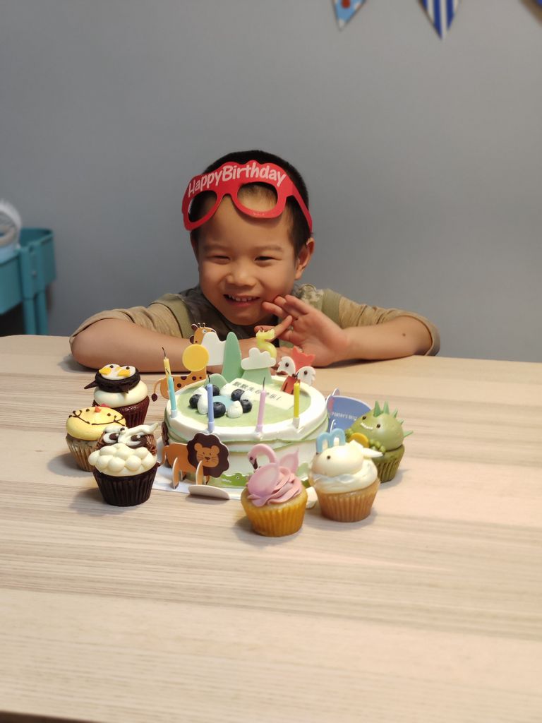 该吃蛋糕了。今年的蛋糕是默默自己选的,派悦坊的森林音乐会。很可爱也很热闹。爸爸还另买很多配套的小动物蛋糕来捧场。