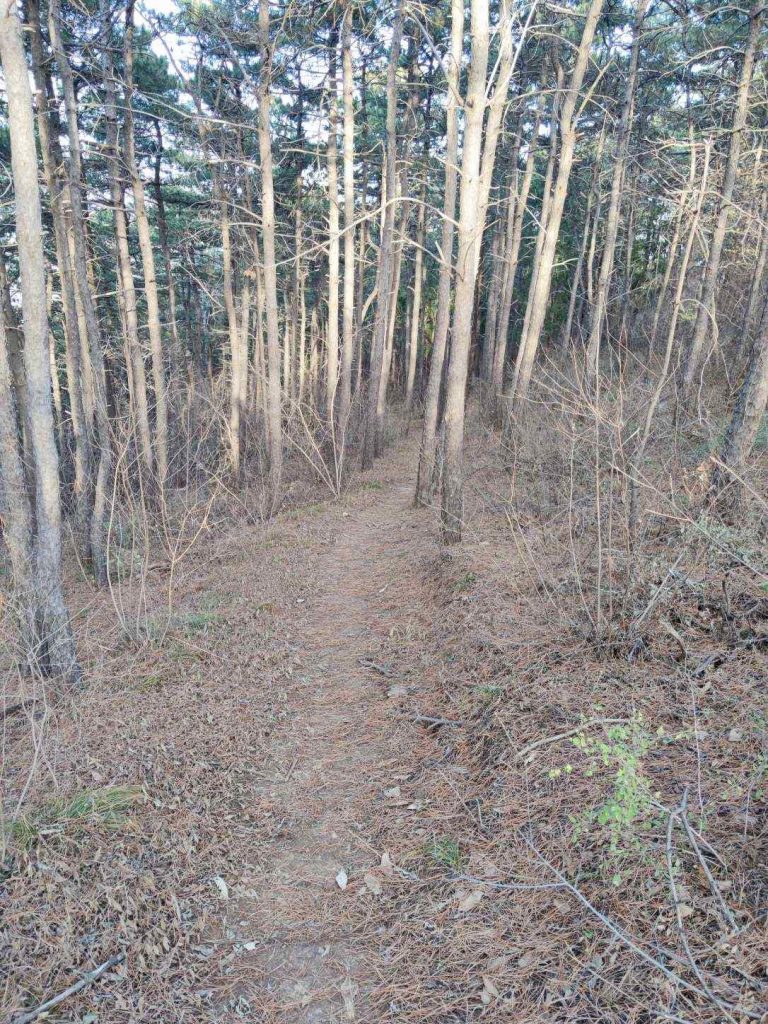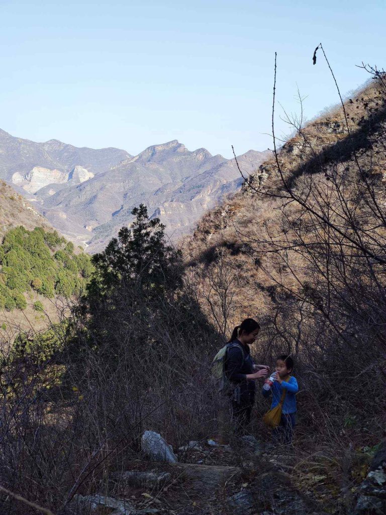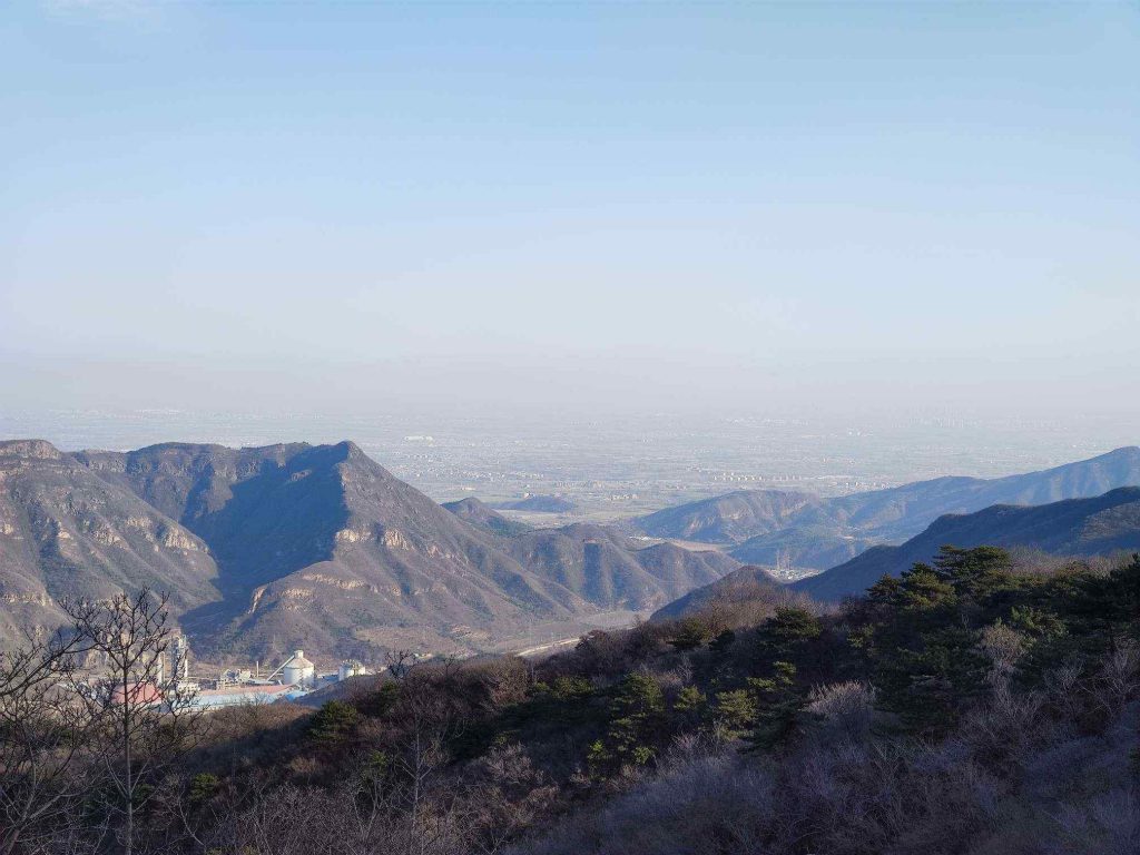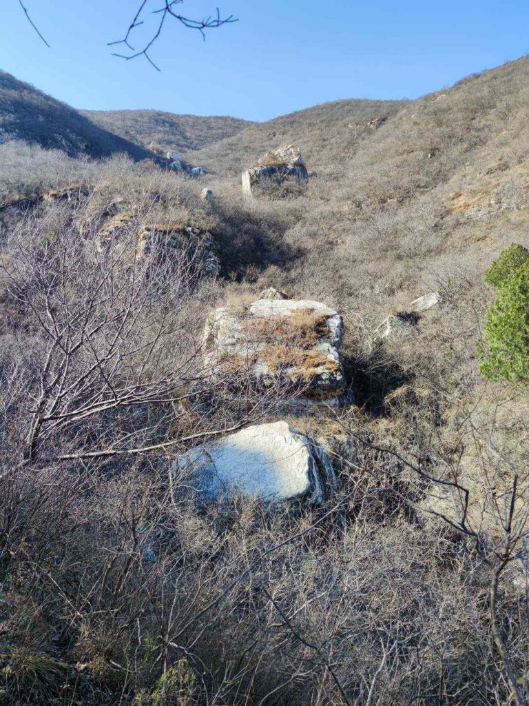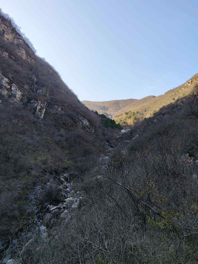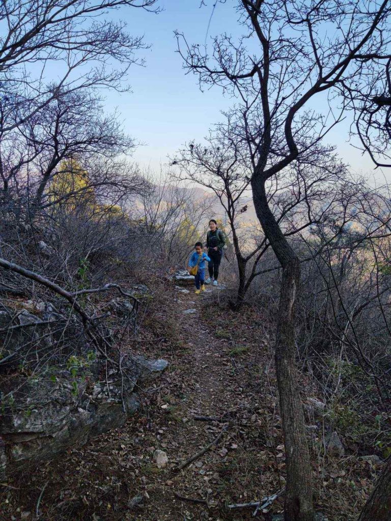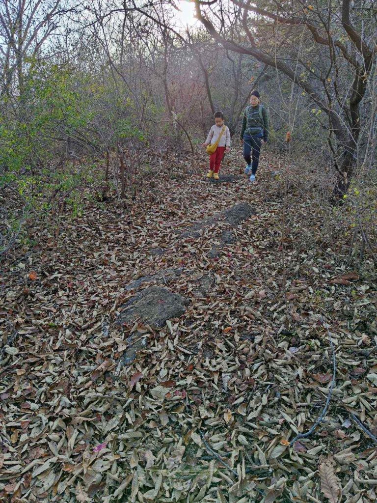 沿着南山脊一点一点下降。穿过了华北栗林和柏树林,满地的落叶踩上去沙沙的。