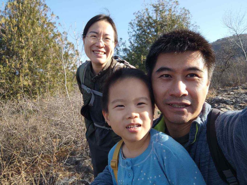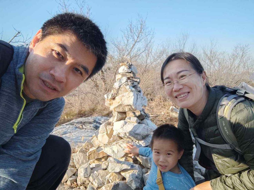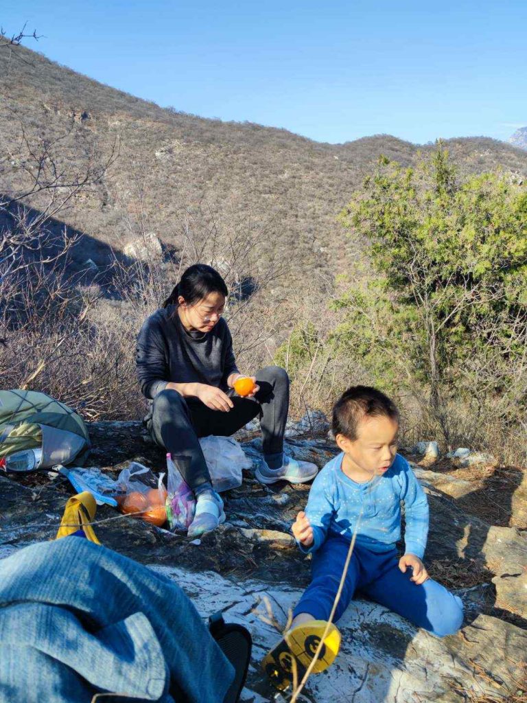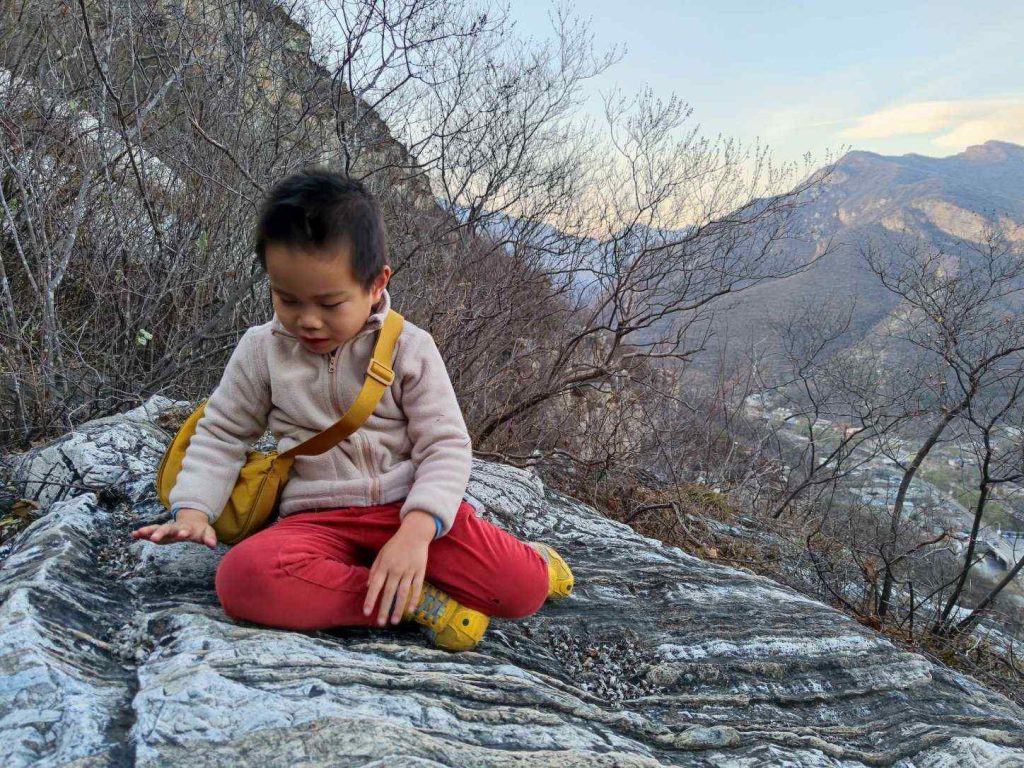 栈道走完再向上就是土路了,两边的芒草正好跟默默差不多高,总是被戳中头的默默很是苦恼。往上爬了一个多小时,在离山顶不远的地方终于能晒到太阳了,我们找了一块大石头坐下来吃午餐。妈妈掏出6个果冻橙,爸爸掏出一袋鱼片,默默掏出一颗巧克力,大家都带了不少私货……。山沟里滚落着几块巨大的石头,好奇它们是从哪里来的?