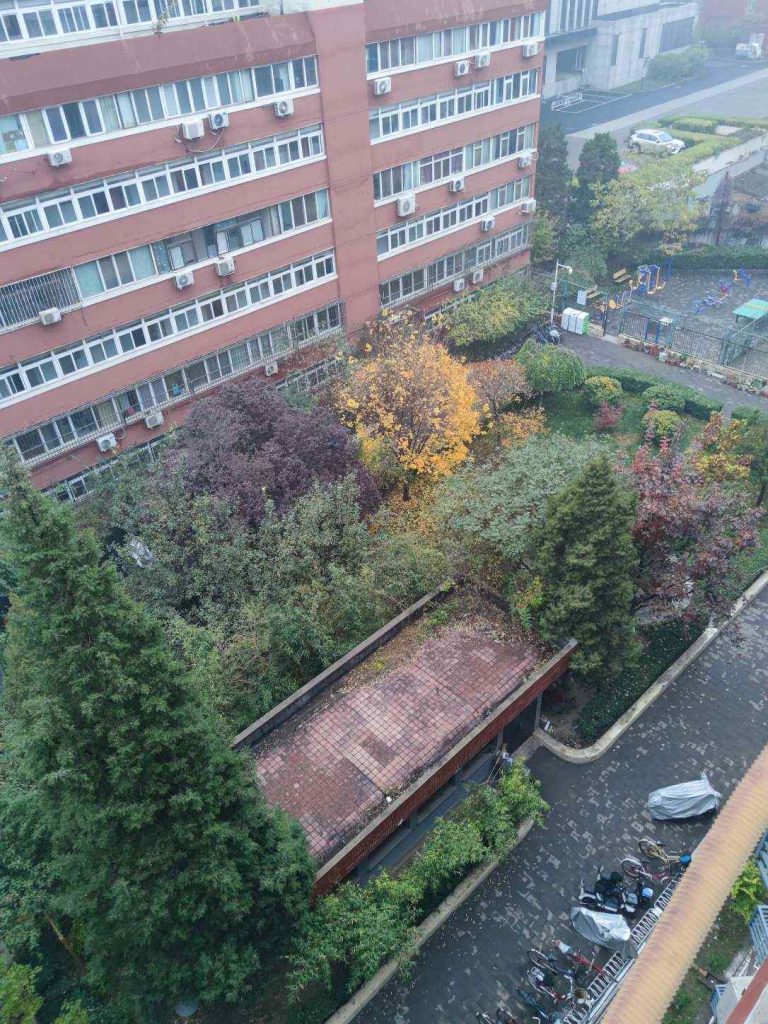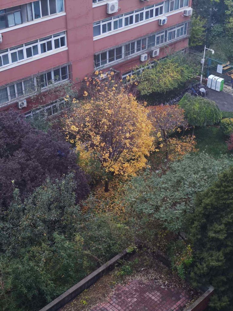 谐趣园外面的山坡上,幽静极了。喜鹊们跳过来跳过去,享受着没有人类打扰的幸福。有一棵很高的白蜡,叶子全变红了,而不像别的白蜡是黄色。跟旁边青翠叶子银白树皮的白皮松一起,有种清冷的美感。