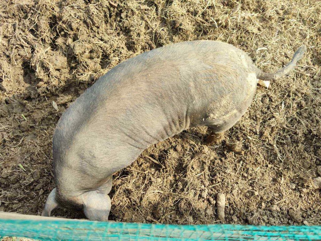 在菜园旁养有两只猪,两只羊,正好拿萝卜叶子去喂羊。