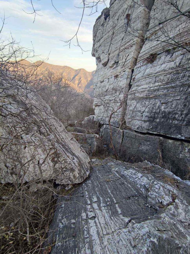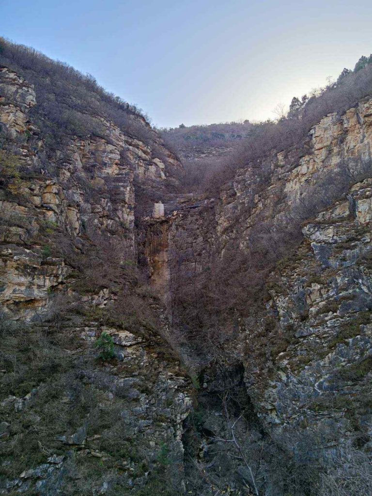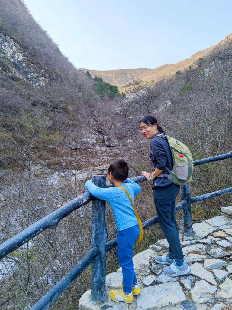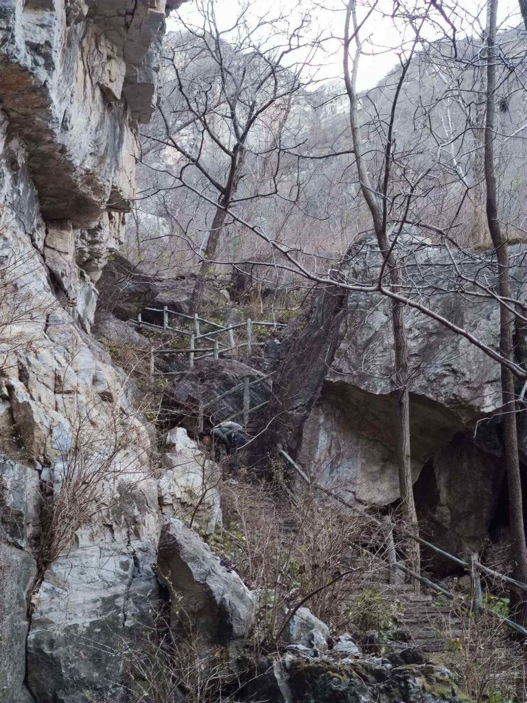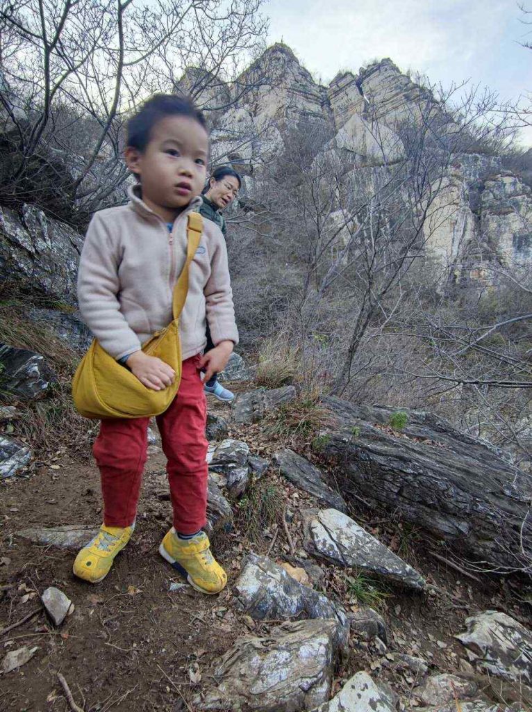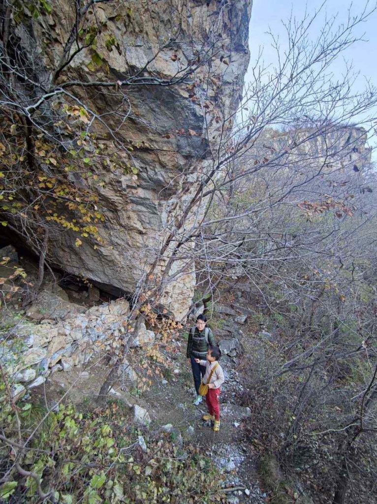 上山前一半都是修整完好的栈道,降低了不少难度,对小朋友很友好。山谷里全是滚落的石块,拼成了小溪的河床,一路都能听见叮叮咚咚的水声。山中还有一处干涸的瀑布,夏天有水的时候应该也是很漂亮的。