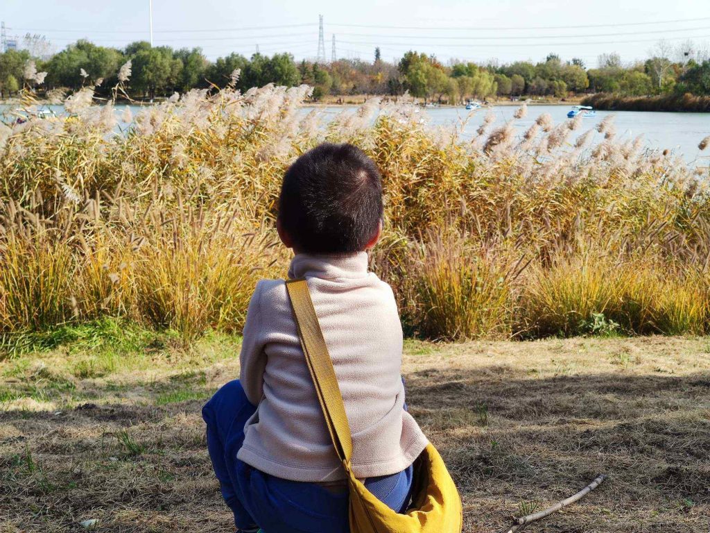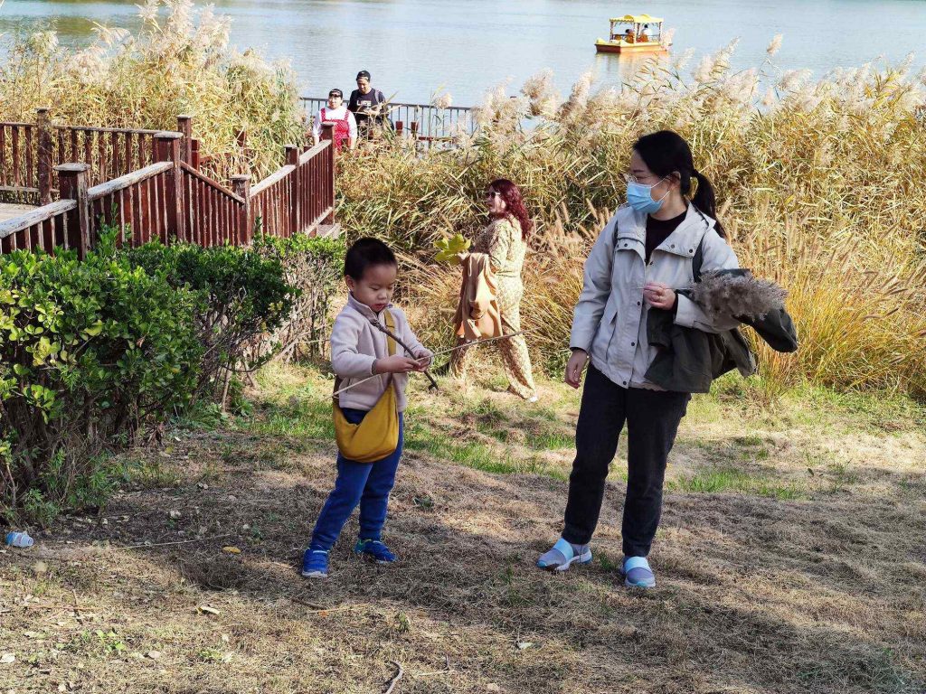 湖边长满了高高的芦苇,不少拍照的人。默默也去凑热闹,不过最喜欢的还是捡树枝。