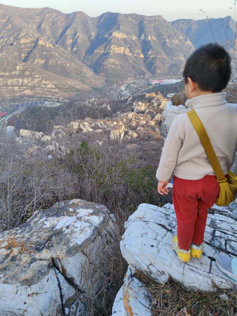 终于来到醉石林的边缘,向下俯瞰很壮观,一片参差不齐的巨大的白石阵。我们沿着轨迹指示的一条小路一点一点下降,旁边就是悬崖,爸爸妈妈都攥紧了手心,紧紧地拉着默默一点一点往前挪。走了十几分钟,终于下降到了大平台。