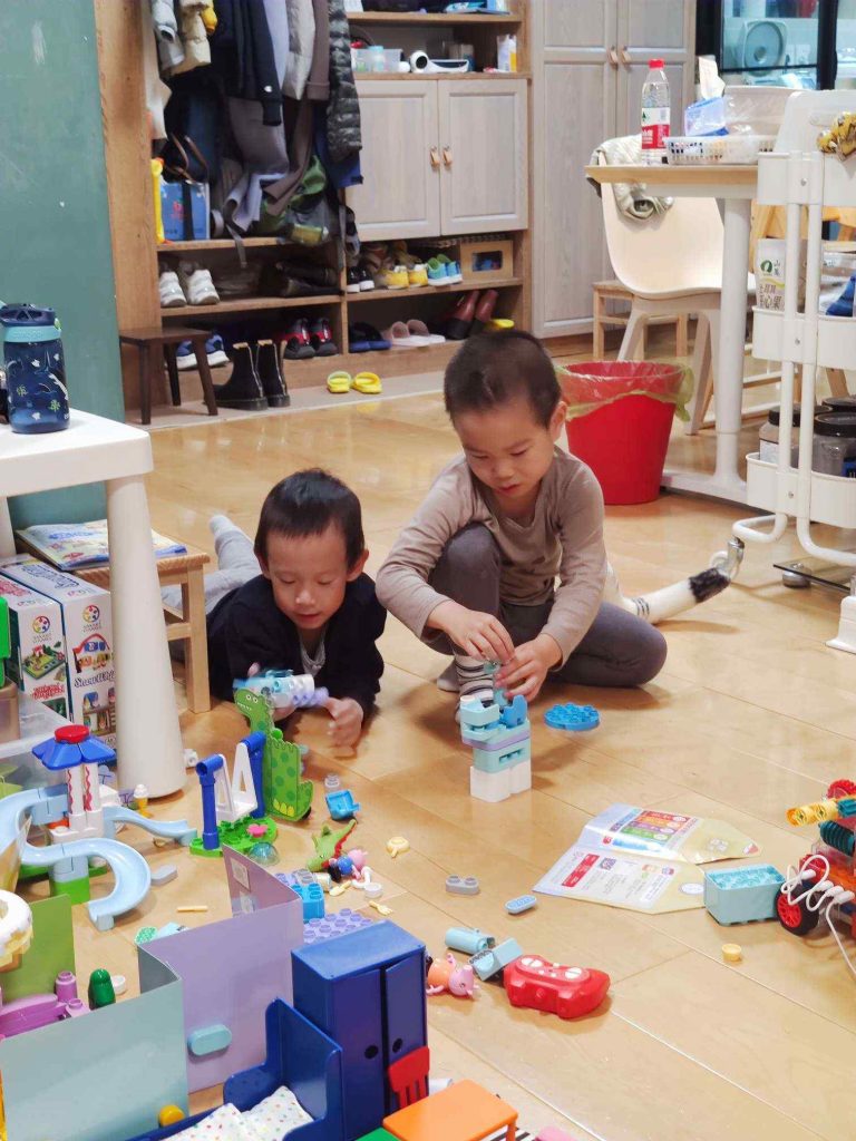 午餐结束,小朋友们玩起了营地车,有拉有推,配合得不错。