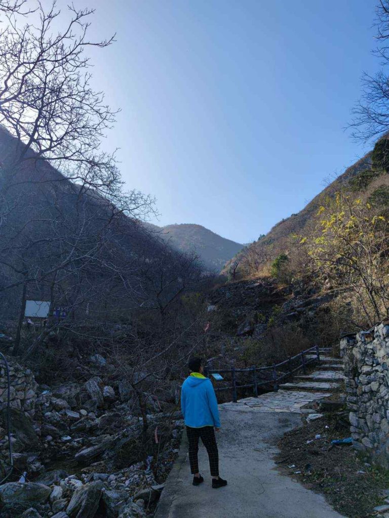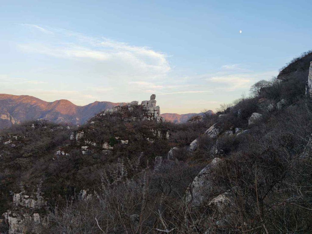 终于从小路下到景区路,已经离山下不远了。太阳也快彻底落山了,气温明显降了下来。另一座山顶有一堆叠放的石头,应该算是一个景点了。