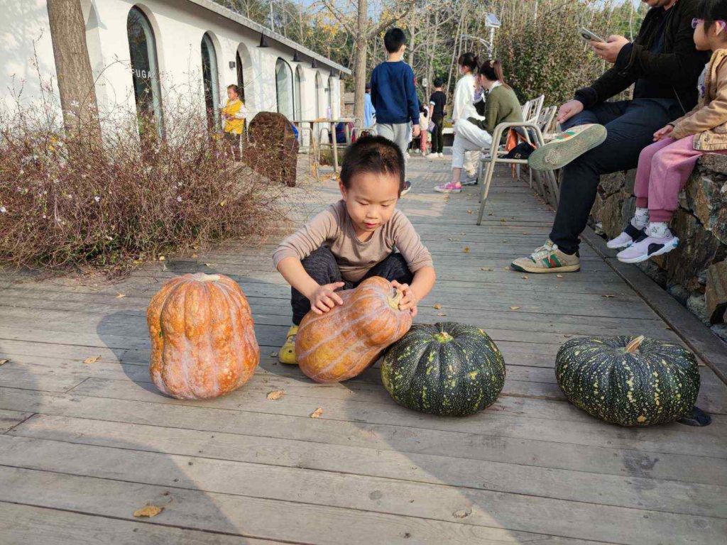 没过一会儿到了活动时间,今天的活动是做披萨饼。默默是第一次去,也去尝个新鲜。农场里到处都有装饰的南瓜,默默就喜欢把它们排成一排,而且是按规律摆放。斑马后遗症。