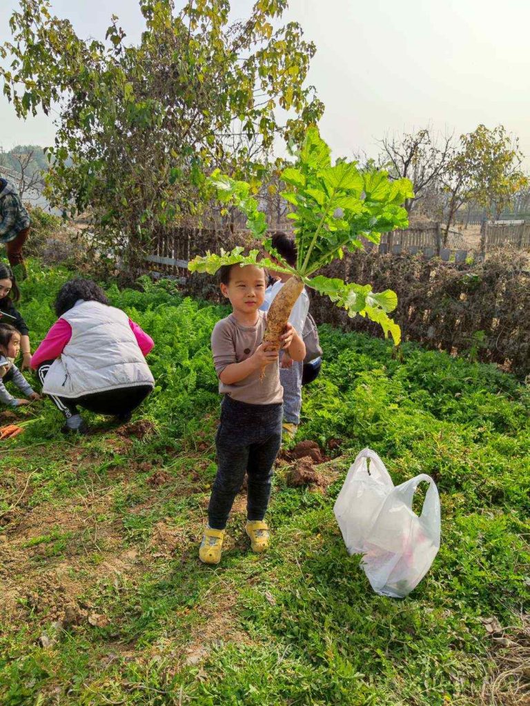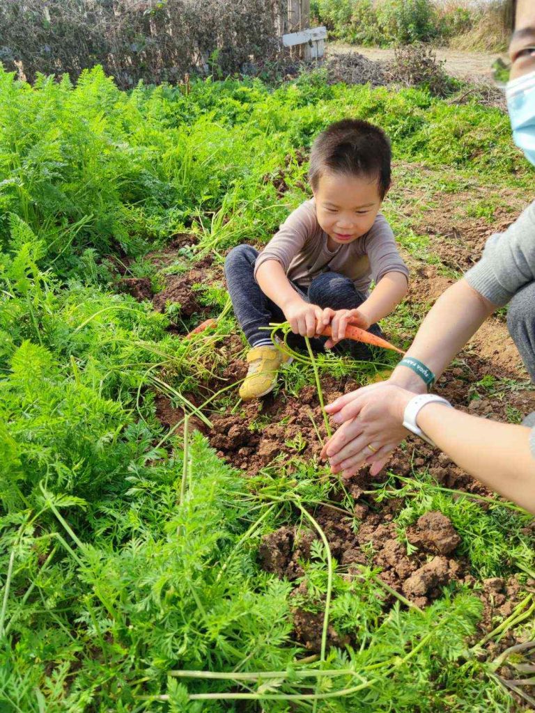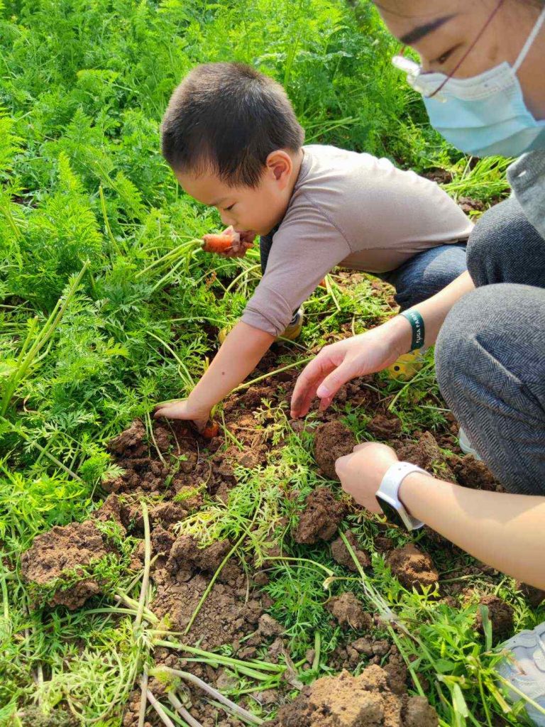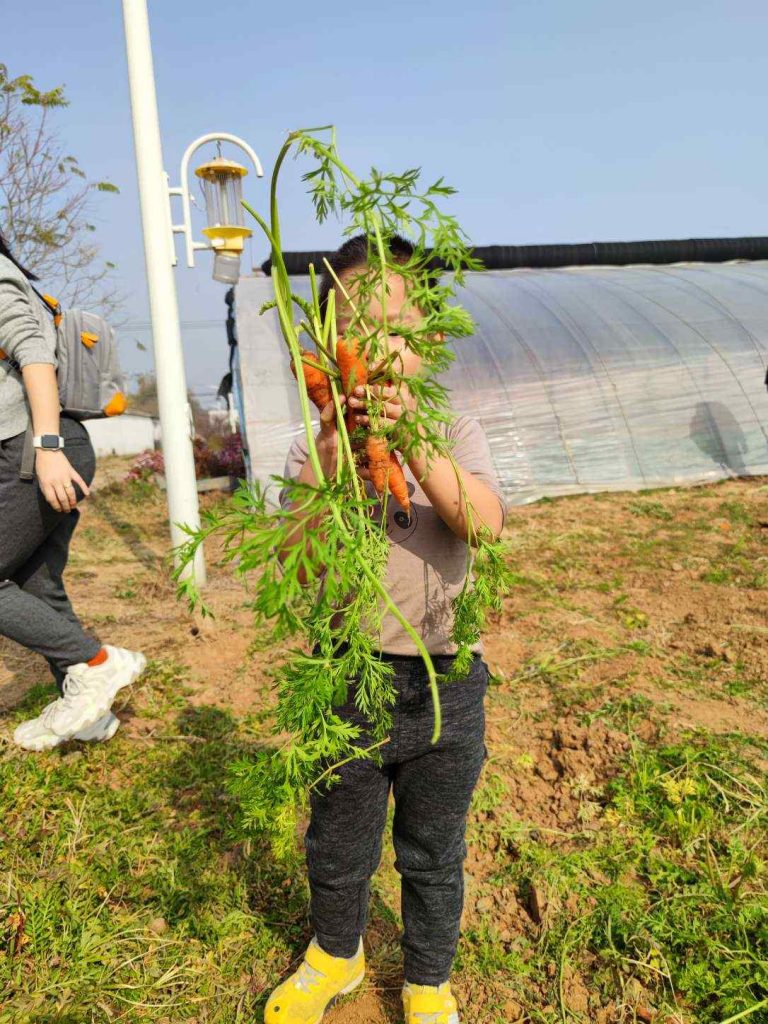 搭好帐篷,第一步就是去拔萝卜。地里种了胡萝卜和白萝卜,默默最喜欢胡萝卜了。也等不及用铁锹把土铲松,上来就用手刨,收获满满。