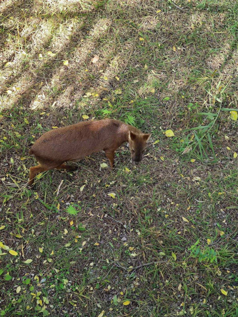 栈道绕着麋鹿苑的外围转,栈道旁放养了不少孔雀和河麂——一种长獠牙的小鹿。