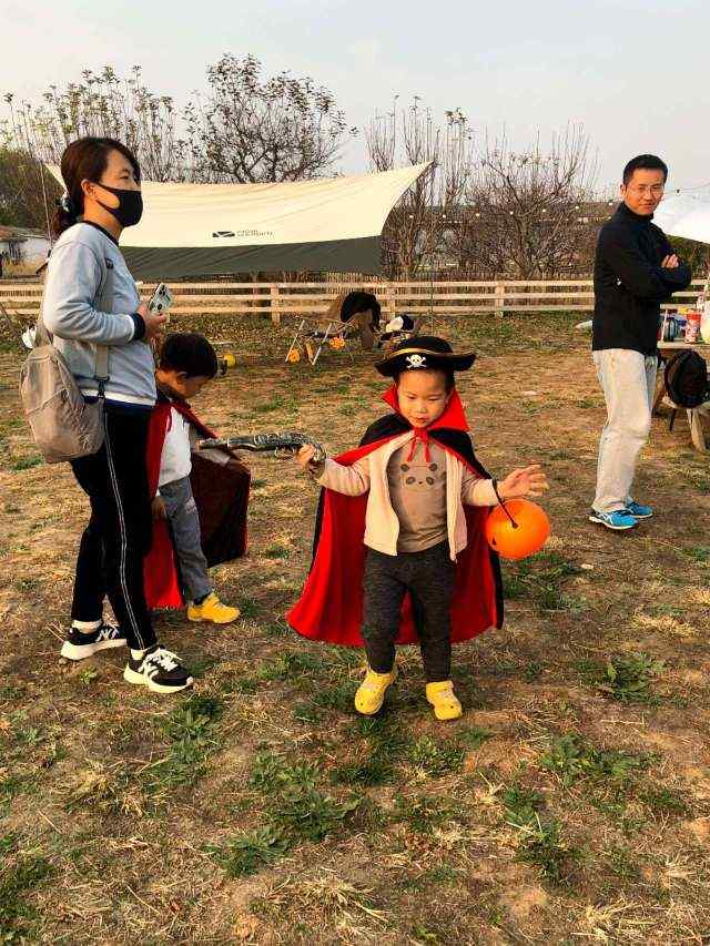 逛完所有大棚,时间就已经不早,万圣节主题讨糖活动开始了。一个海盗船长在营地把所有孩子集结起来,大家一起挨门挨户去讨糖。孩子们都穿上了提前准备好的cosplay,各式各样,好不热闹。默默这次扮的是海盗船长,提前准备好的南瓜灯终于派上了用场。芒果扮成了蜘蛛侠,女孩们不用说,全是艾莎和安娜,还有白雪公主。有个女孩扮的死神非常不错,很逼真。不过讨糖的画风跟想像的不太一样,都是一哄而上,有演变成零元购的趋势。