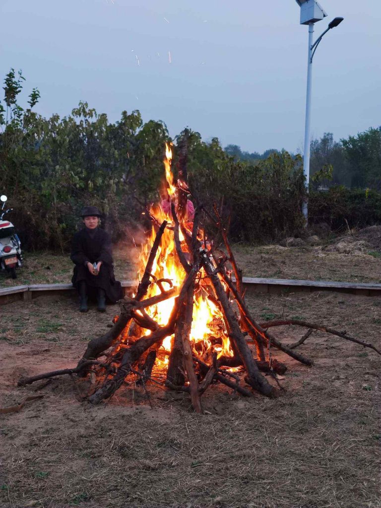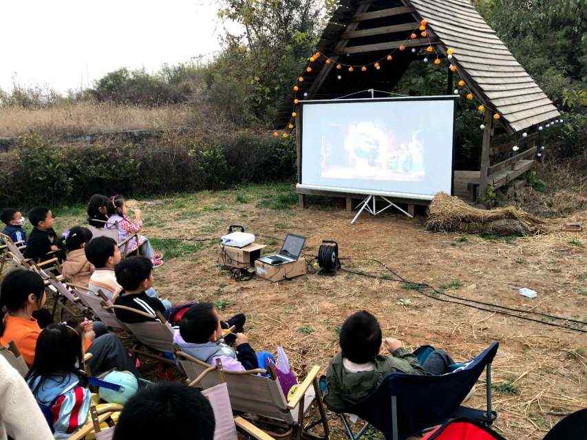 讨糖活动结束,太阳已经快落山了。篝火点起来了,电影也放起来了,小朋友们一起坐在屏幕前享受回家前最后一个小活动。