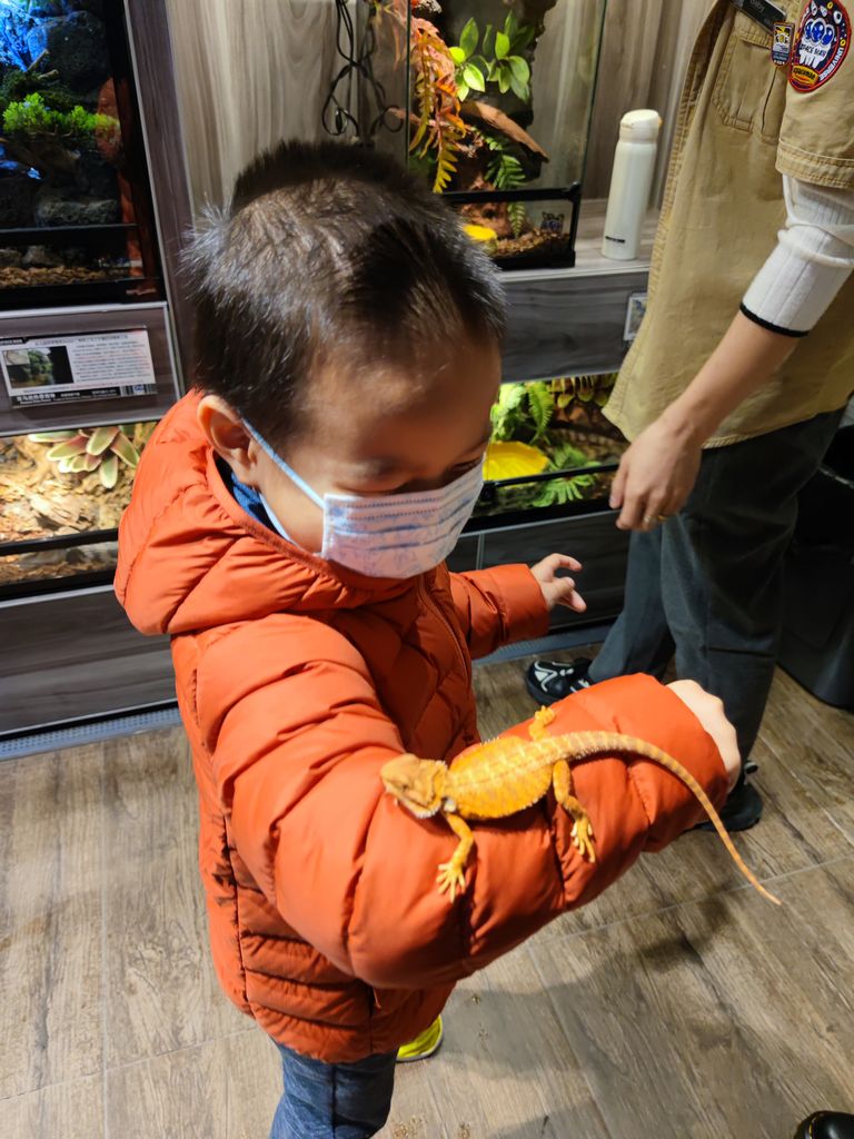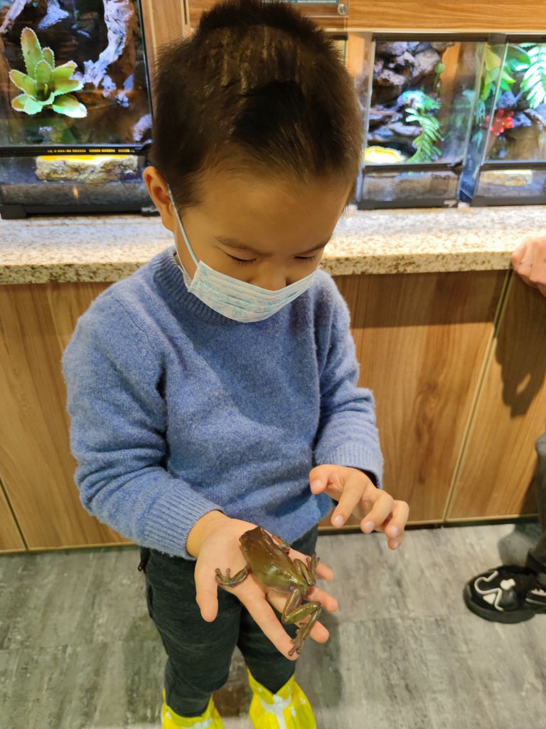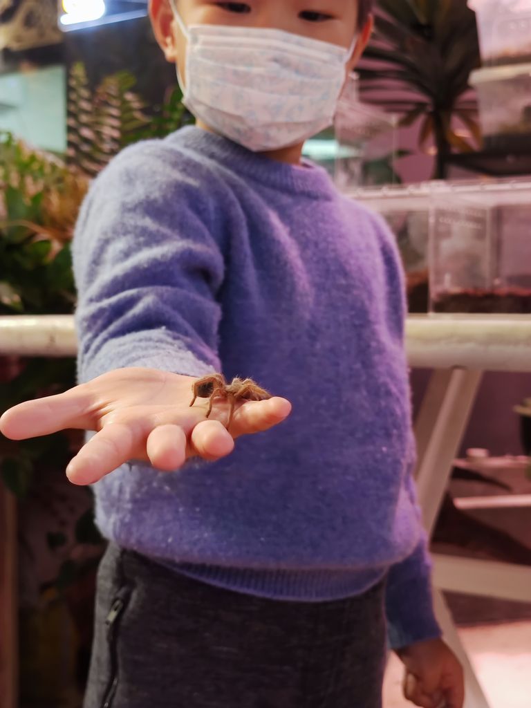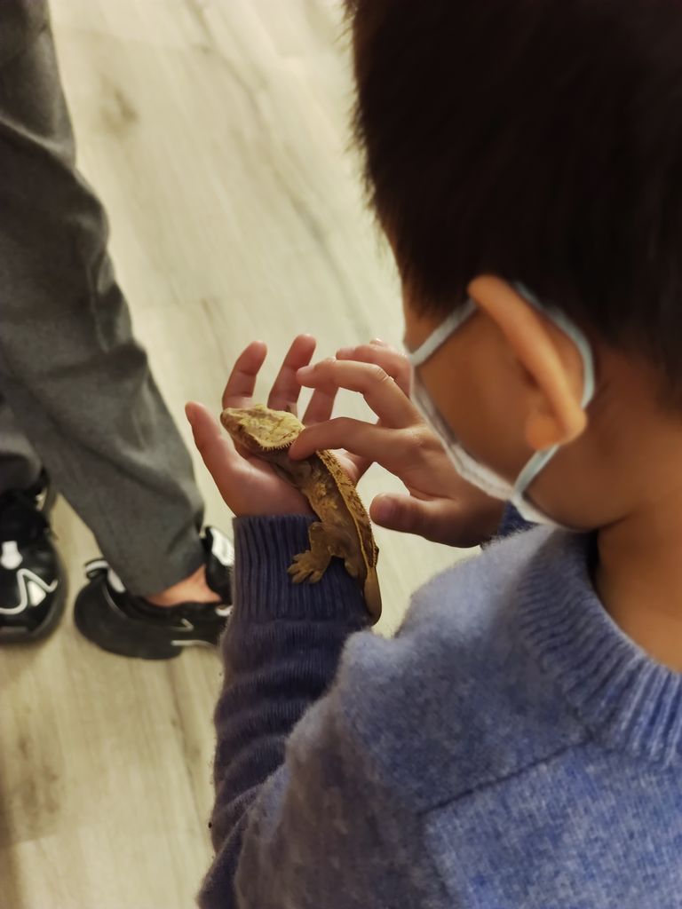 登记进门,马上就有一个讲说的大哥哥来给我们讲解。第一种叫棕狮蜥,直接就放到了默默的手臂上。还有各种各样的石龙子、青蛙、守宫。