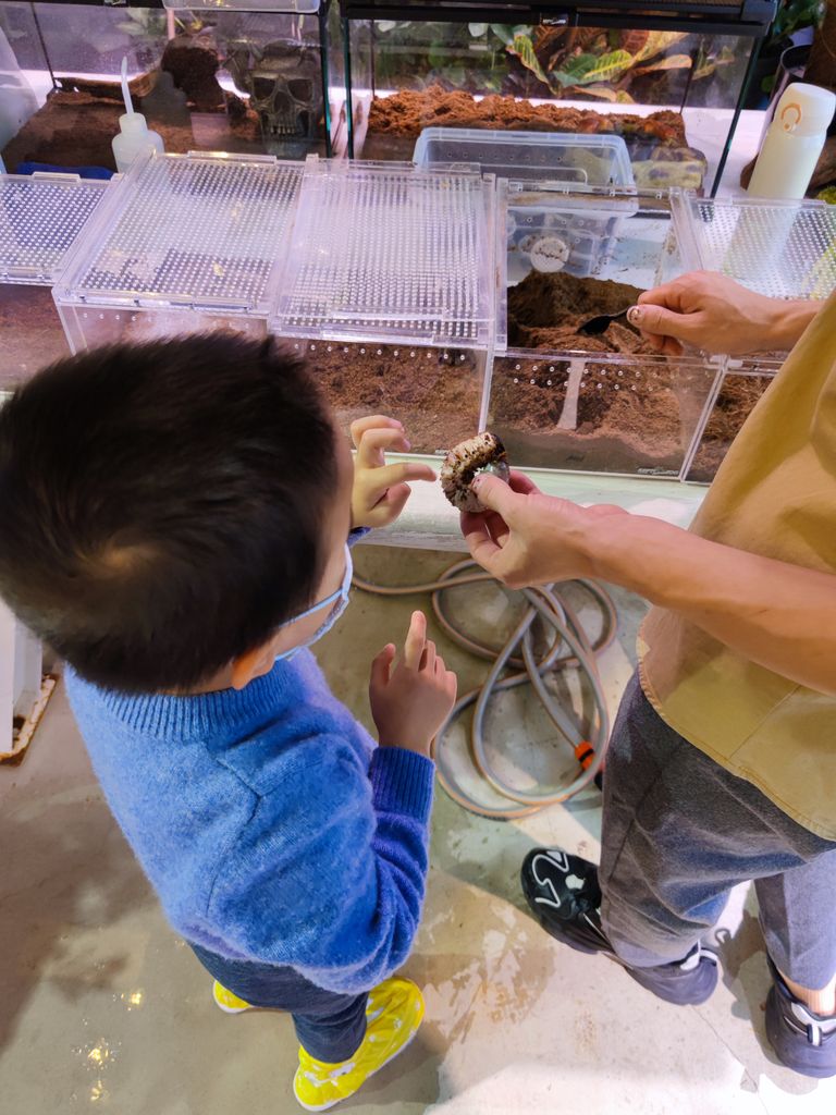 在一个小屋子里有很多昆虫,还有四大毒物。妈妈和默默还去摸了摸一种大甲虫的硕大幼虫。