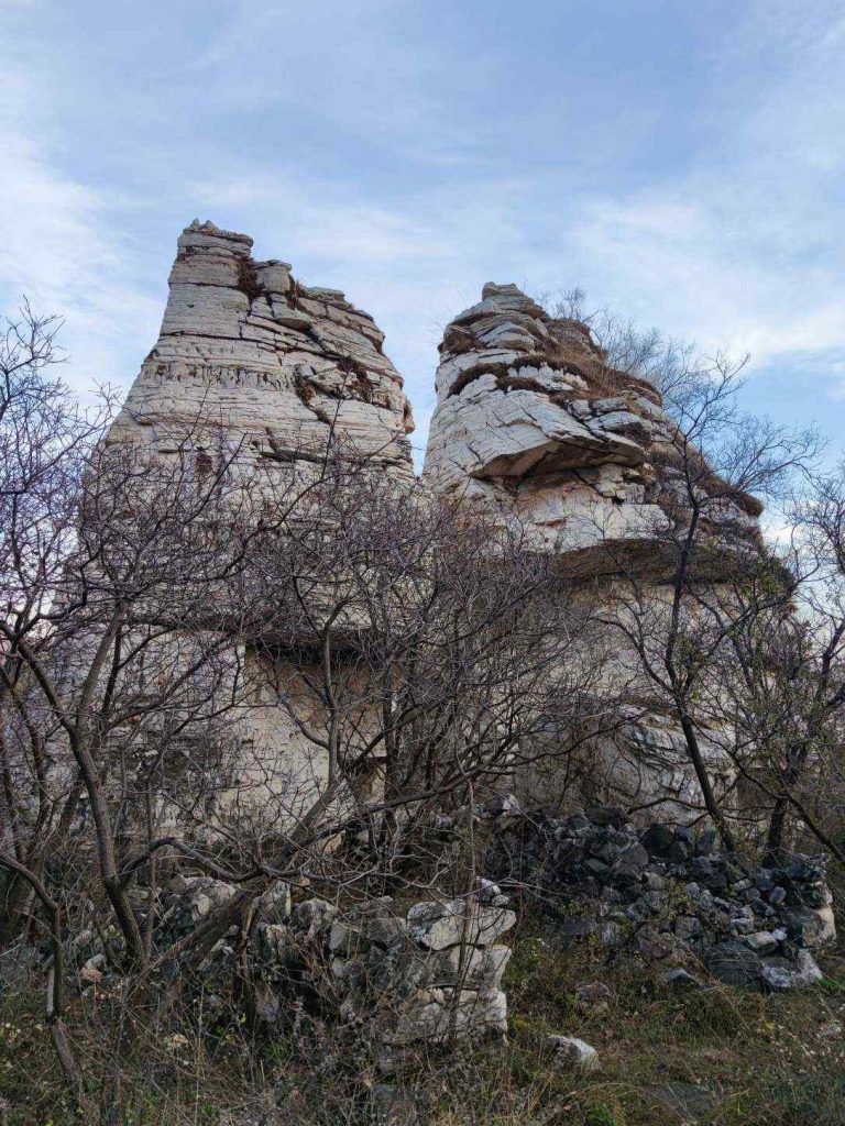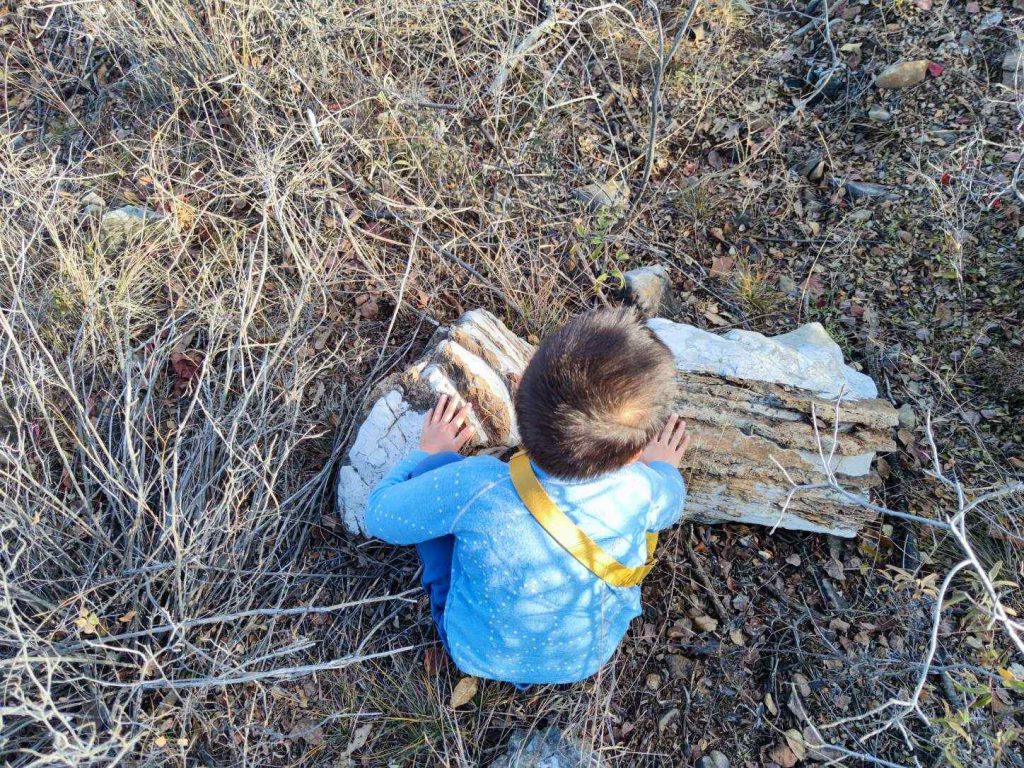 大平台就是一片比较平的石头,四周像石林一样耸立着大大小小的白石块。有一块石头很像骆驼头,默默说是长颈鹿。另一边的两块石头,默默说是两只老虎。