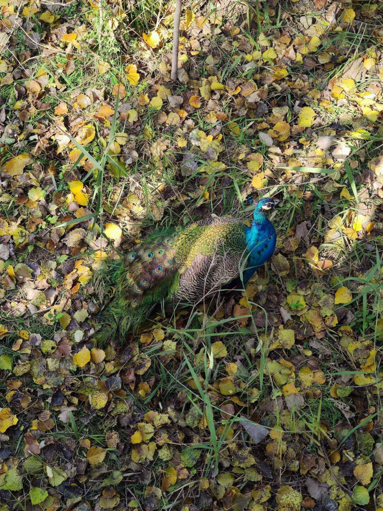 在拓展区的拐角,遇到一位孔雀妈妈带着小孔雀一边散步一边觅食,很萌很可爱,引的小朋友们都来围观。