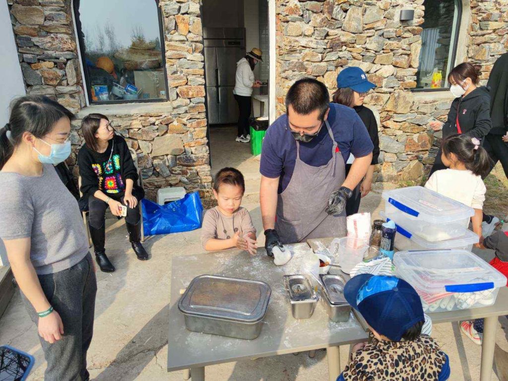 做披萨的活动是一个老师带着小朋友亲手做披萨。披萨是生的,但上面的料都是熟的,旁边有一个水泥披萨炉,用炭火烤,速度还很快。