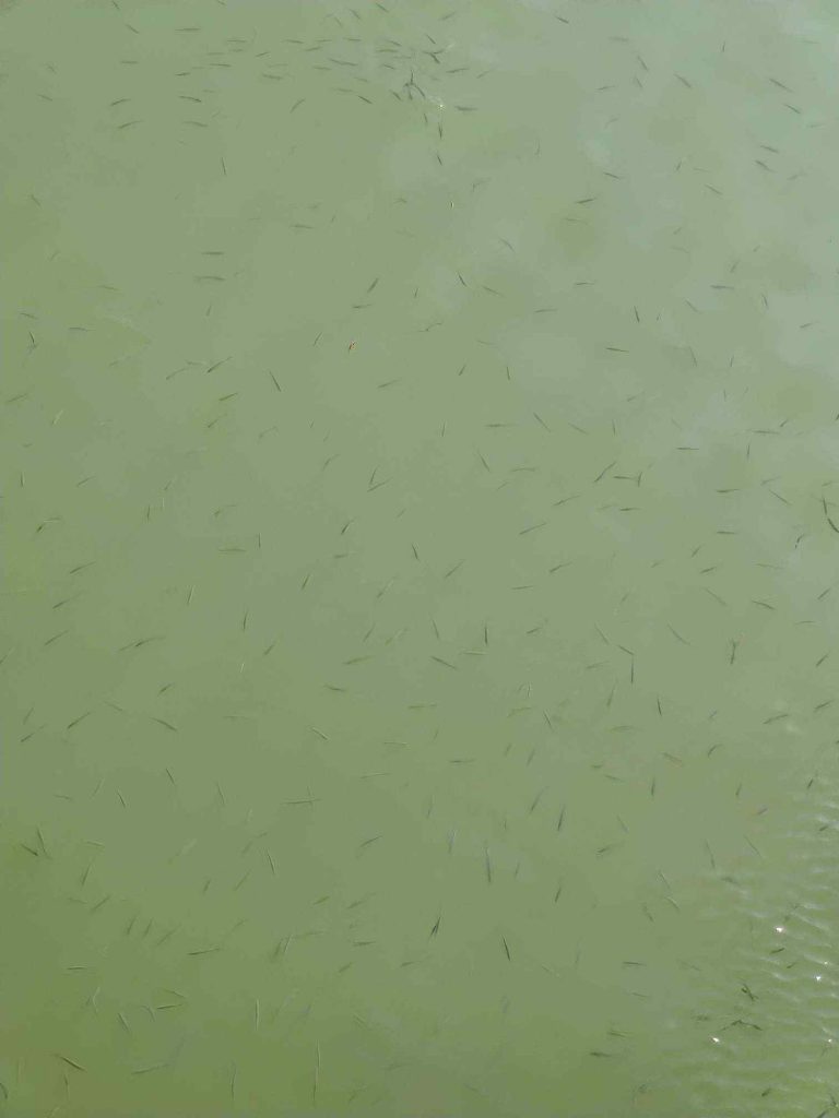 我们沿西岸向北走,经过一座小桥,算是一处高点。桥下的小鱼分布的很均匀,都在晒太阳。