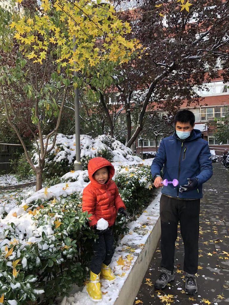 等到爸爸下楼加入战团,我们三人一起打雪仗,默默玩儿的可开心了。