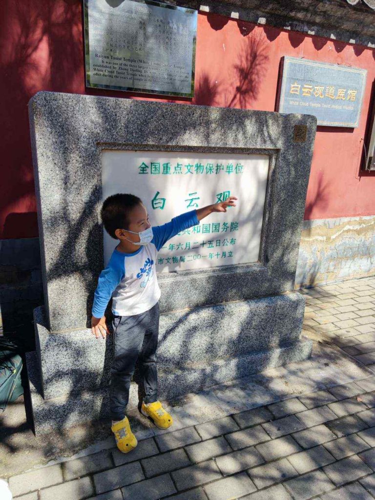 今天是个晴天,默默还是坐爸爸的自行车去上课。下课时间是10:10,离午餐还有一段时间,于是默默在里面上课,爸爸妈妈在外面商量一会儿去哪里逛逛。最后选定了白云观,主要是为了满足爸爸妈妈的好奇心。