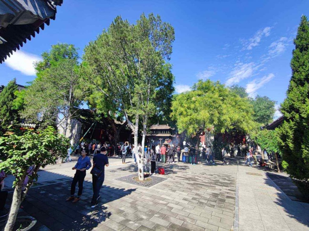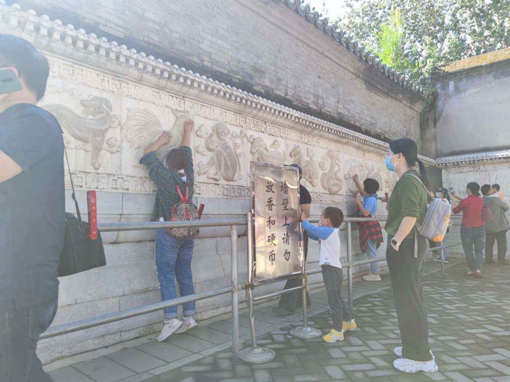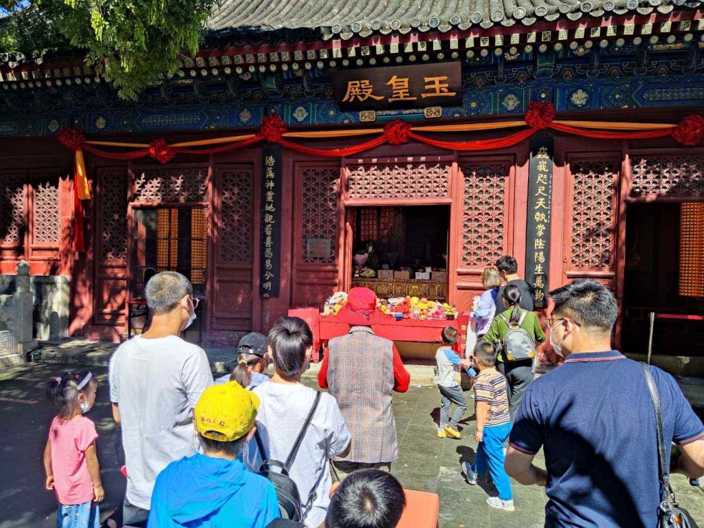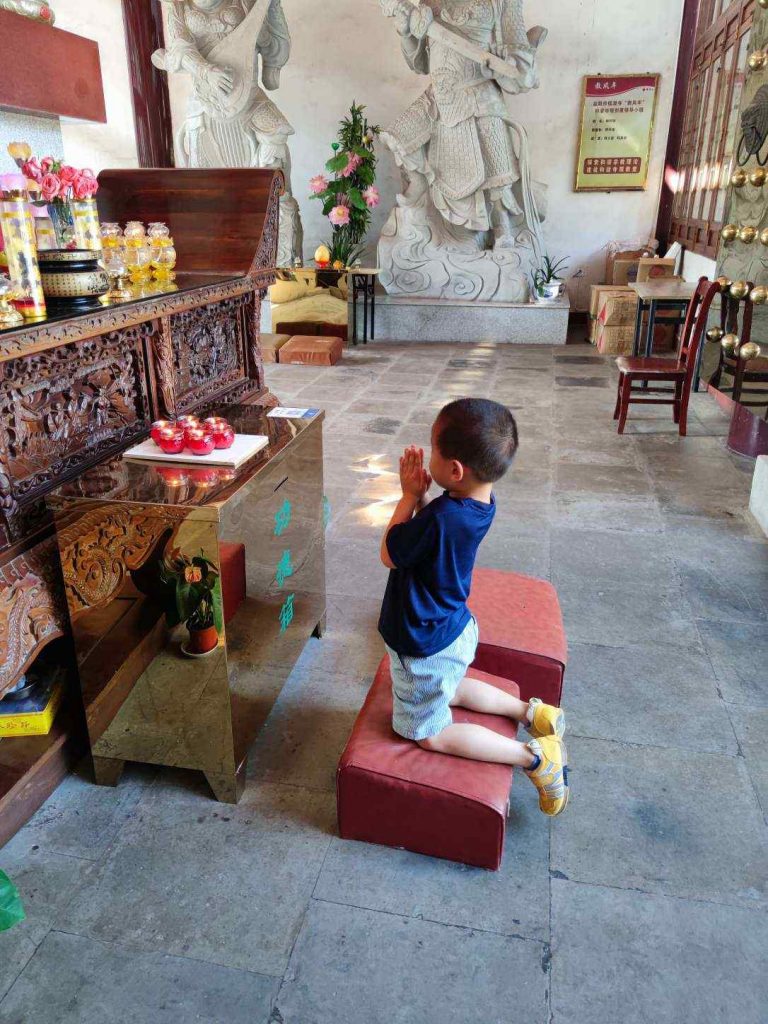 下课后骑车来到白云观,没想到地方挺大,而且香火非常旺。默默看着善男信女磕头烧香,满头问号,问题一个接一个:为什么要烧香?为什么要放供品?为什么殿里的人是假的,供品却是真的?很多问题爸爸妈妈也答不上来。默默很执着的想要看清殿里的人像,不停地往供桌边上凑,差点就进殿了。