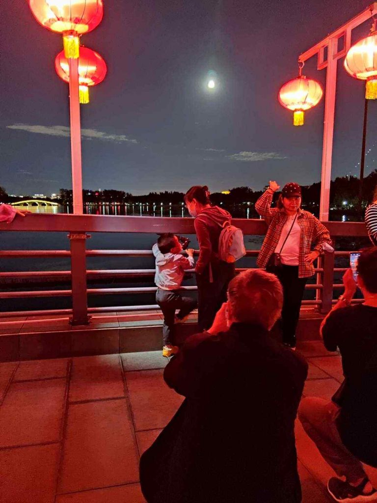 吃完饭我们抓紧时间出门,要不一会儿月亮升得太高太亮就不好拍照了。到了玉渊潭西桥,人山人海。