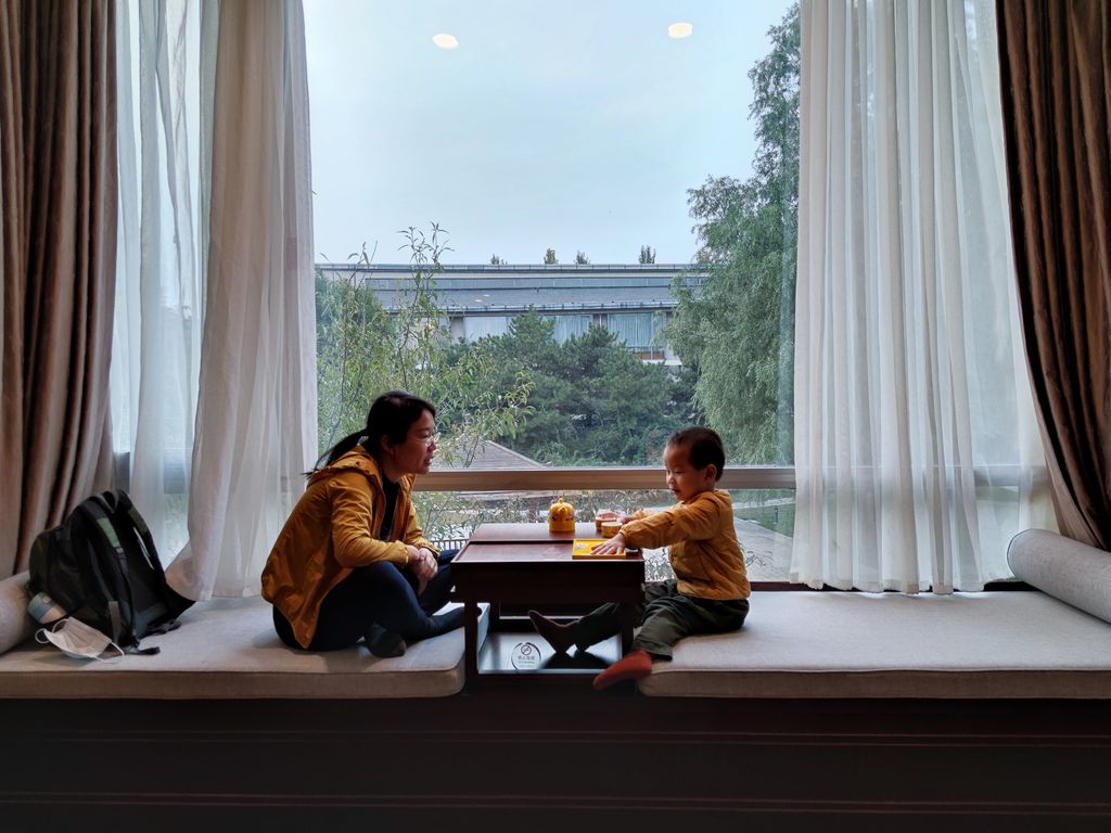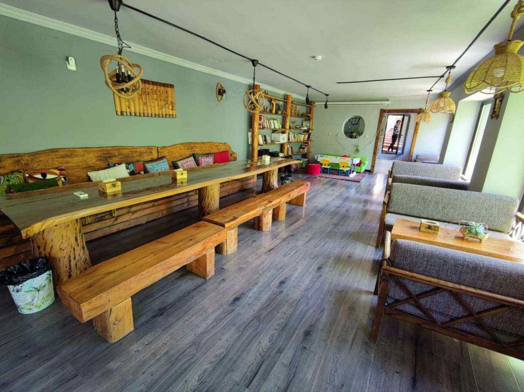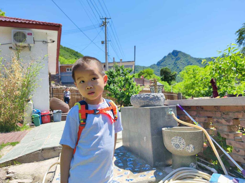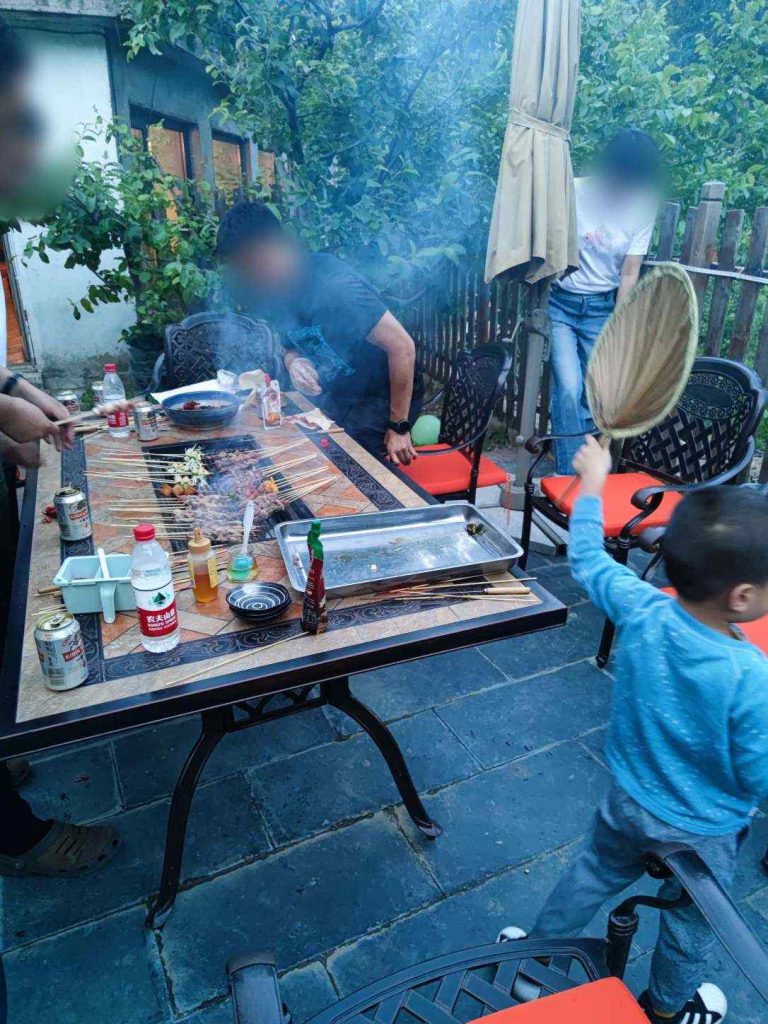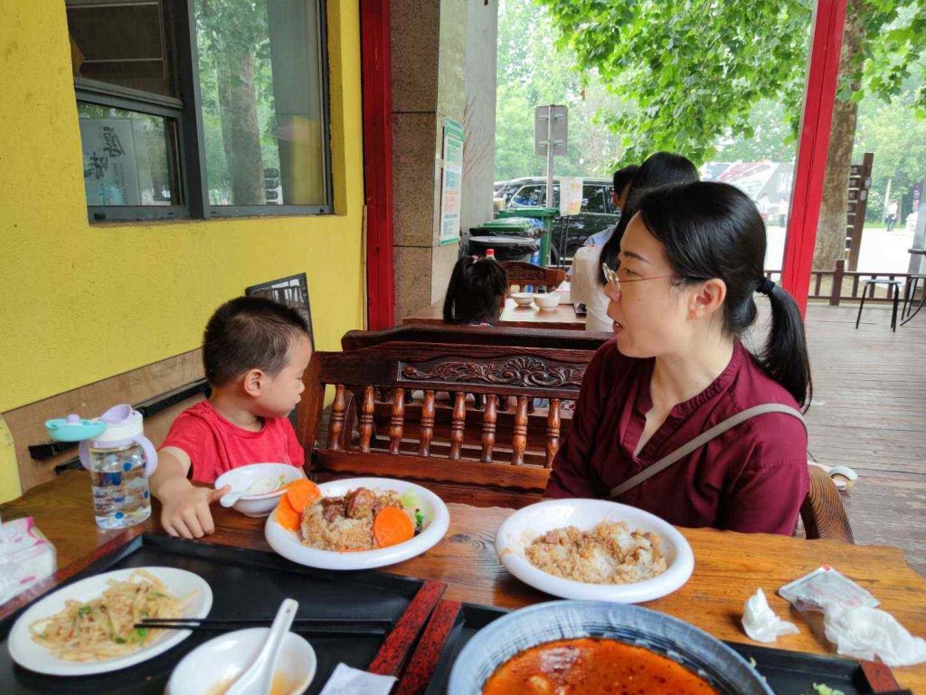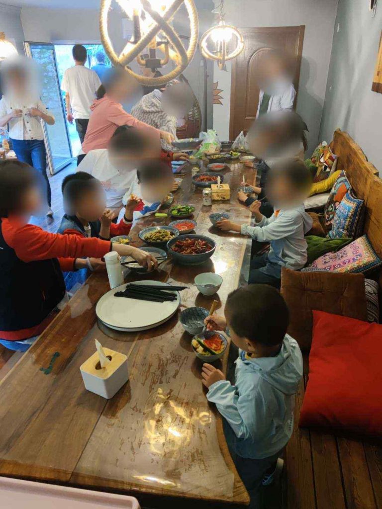 小朋友们陆陆续续都出来活动了,花园里一下热闹起来。随着厨房传来“吃饭啦”的招呼声,大家都奔向餐厅,围坐在大桌前吃早餐。这里的油饼和包子都非常好吃,爸爸一口气吃了四个油饼三个包子,把前两天因为食物中毒落下的热量全补了回来。一会儿得努力爬山了。