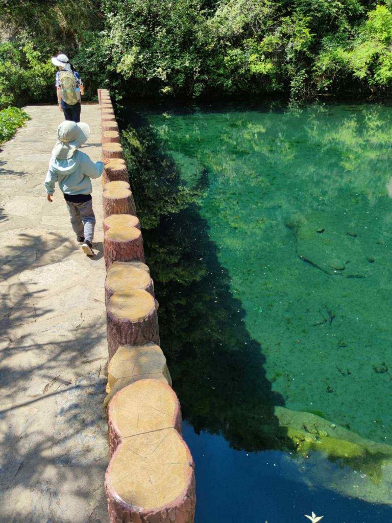 顺着峡谷拾阶而上,一路都是瀑布和水潭,路两侧种满了各种能入药的植物。有不少漂亮的花种,比如丹参和远致。深潭里有些鲤鱼,浅潭里有些蝌蚪,石头缝里还时不时游走出几只蓝尾巴的壁虎(蓝尾石龙子)。最上面的一个潭甚至有了点九寨沟的蓝。这个景区不错,地方不大,人也不多。