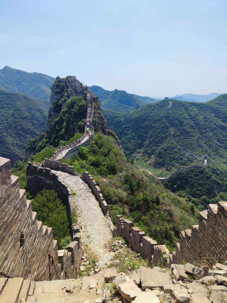 顺着城墙上了这个大坡,就来到了开放段的最高点,两边的长城都很酷,一端险峻一端雄壮。大家在这里各种合影拍照,我们也请晓芳阿姨帮我拍了一张。