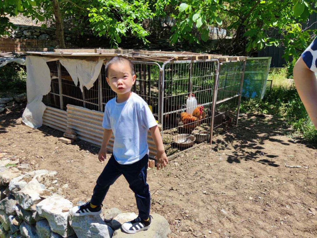 默默晚上睡得很好,早上不到七点就醒来了。跟爸爸妈妈一起醒了会儿瞌睡,然后出门去晒太阳。有阳光的地方非常暖和,一下就驱散了山里的寒气。因为早上的露水很重,杨絮还没开始飘,躺在摇椅上晒太阳太舒服了,真的有淋浴的感觉。默默还给三元拍了个牛奶广告。