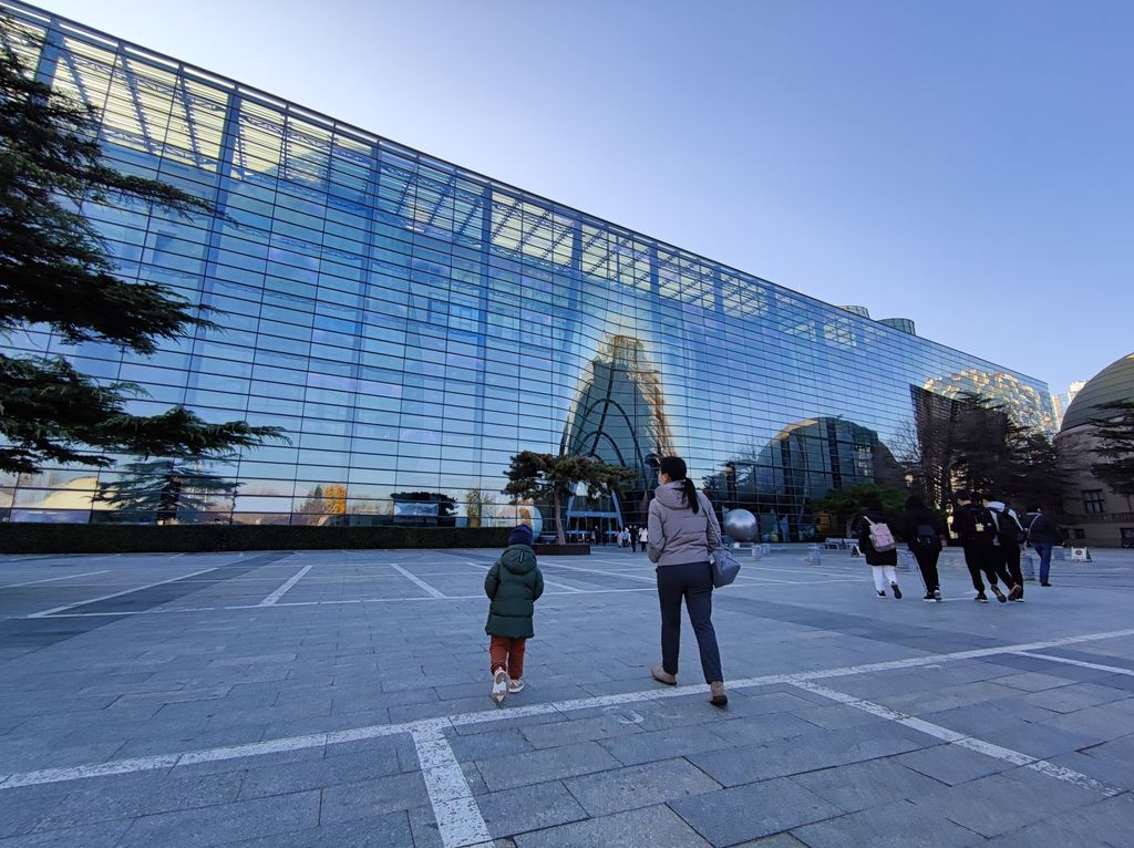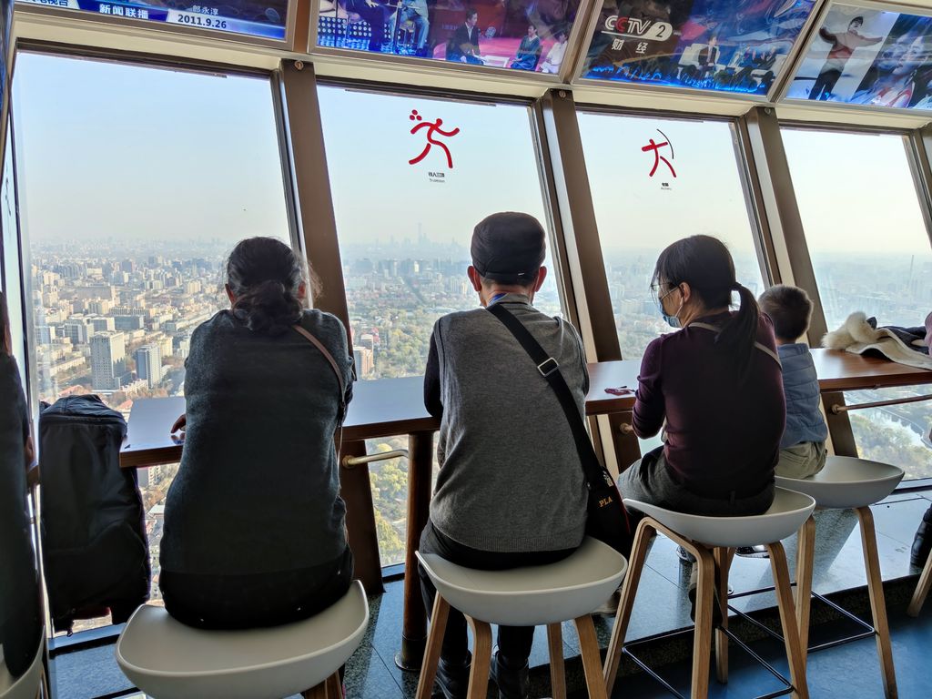 坐上高速电梯上到餐厅层,没想到人气火爆,还需要等位。好在等位时也可以自由在塔上环视京城。今天的能见度很不错,可以看到中国尊。从空中俯瞰玉渊潭很干净,一点不像身在其中时的热闹喧嚣。