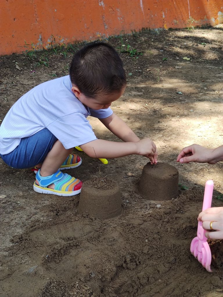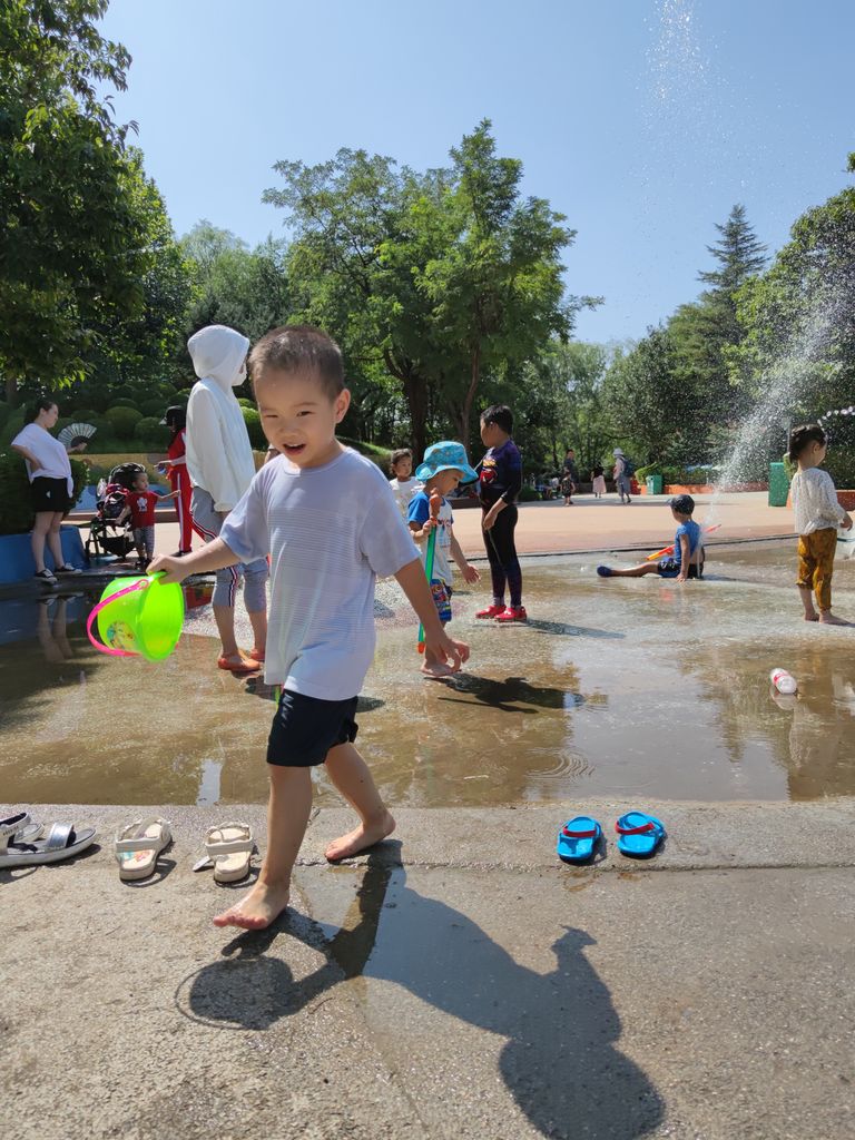 上次在动物园的熊山旁边看到有一条清净的小溪。这次我们有备而来,在熊山旁边爬了一会儿就直奔主题。一米多宽的小溪被几道坎隔成了两汪小潭,坎上就成了小瀑布。水很清也很浅,正适合默默的身高,就是有点凉。玩水的孩子不少,默默也很喜欢。