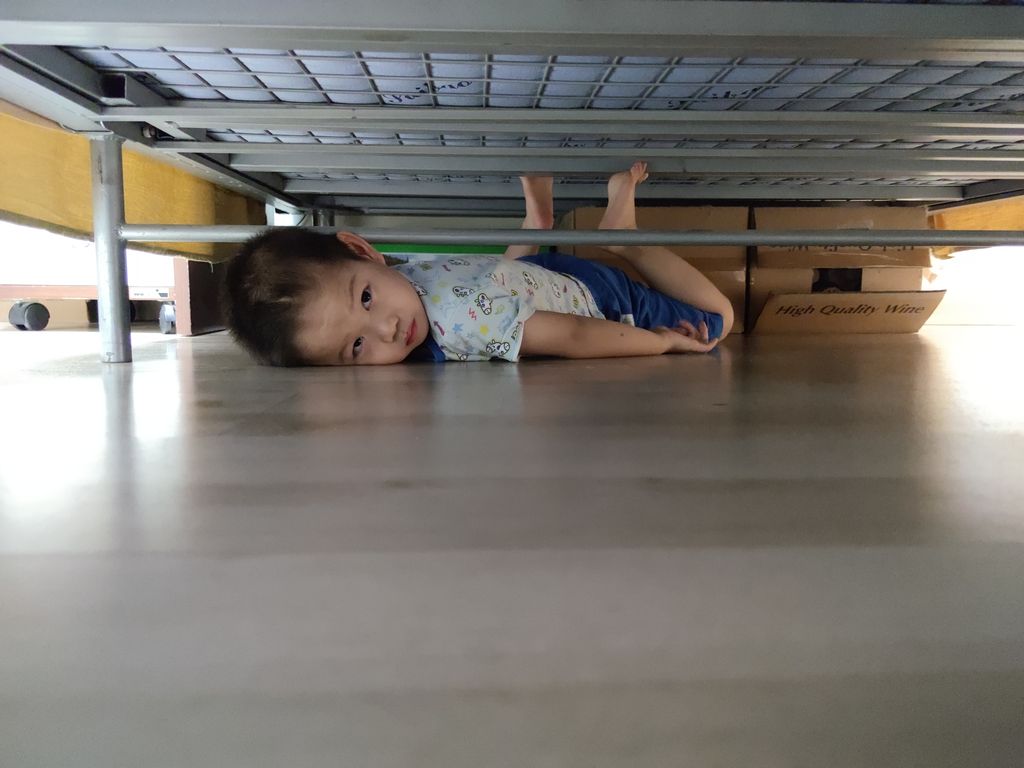 这段时间隔壁开始装修了,白天吵得厉害,于是爷爷奶奶白天就带着默默回北沙滩“避难”。今天是周五,晚上爸爸妈妈下班以后也来了,等吃完饭再带着默默一起回家。调皮的默默在床底下钻来钻去,结果把头钻过床底的横杠以后,缩不回去了,哈哈哈